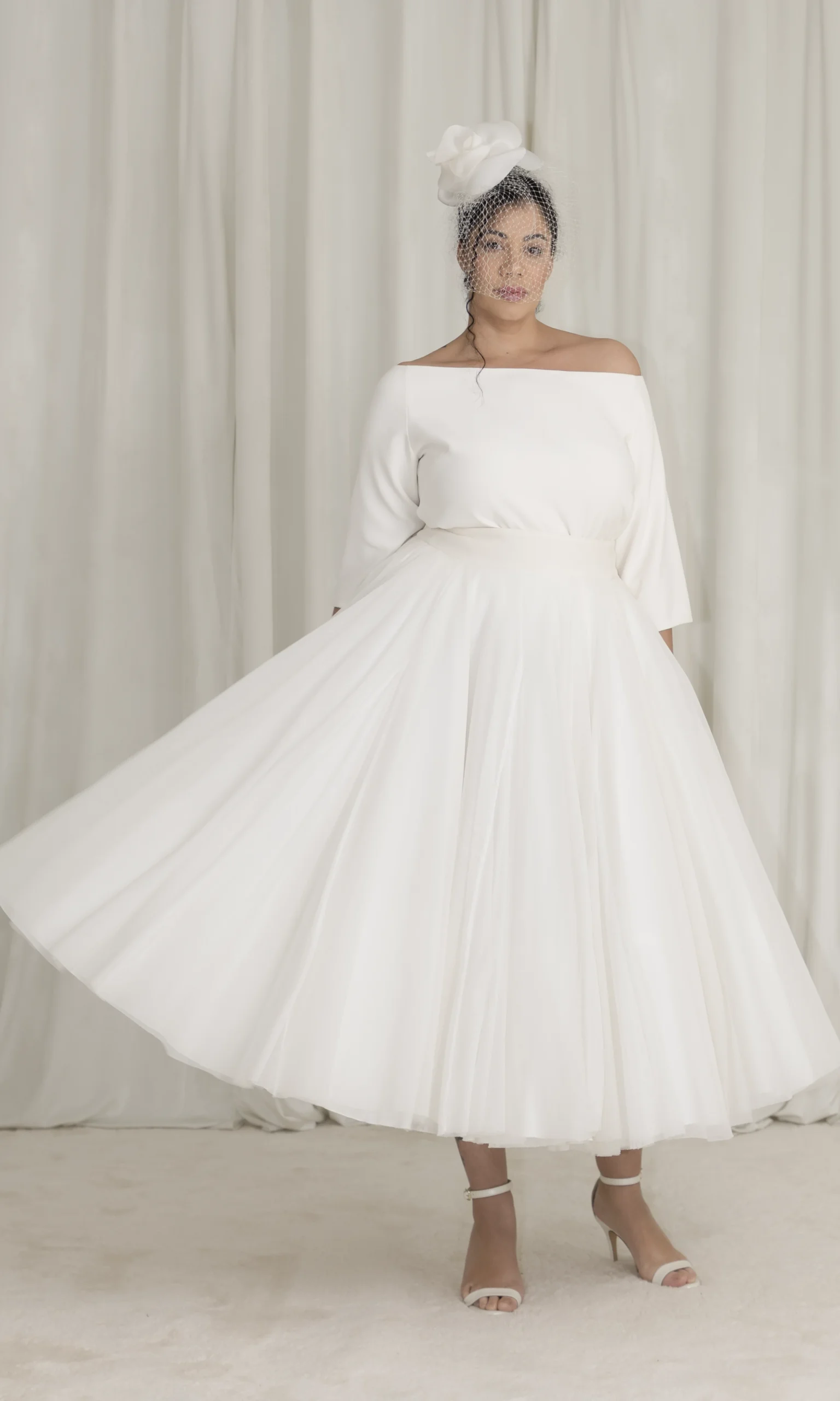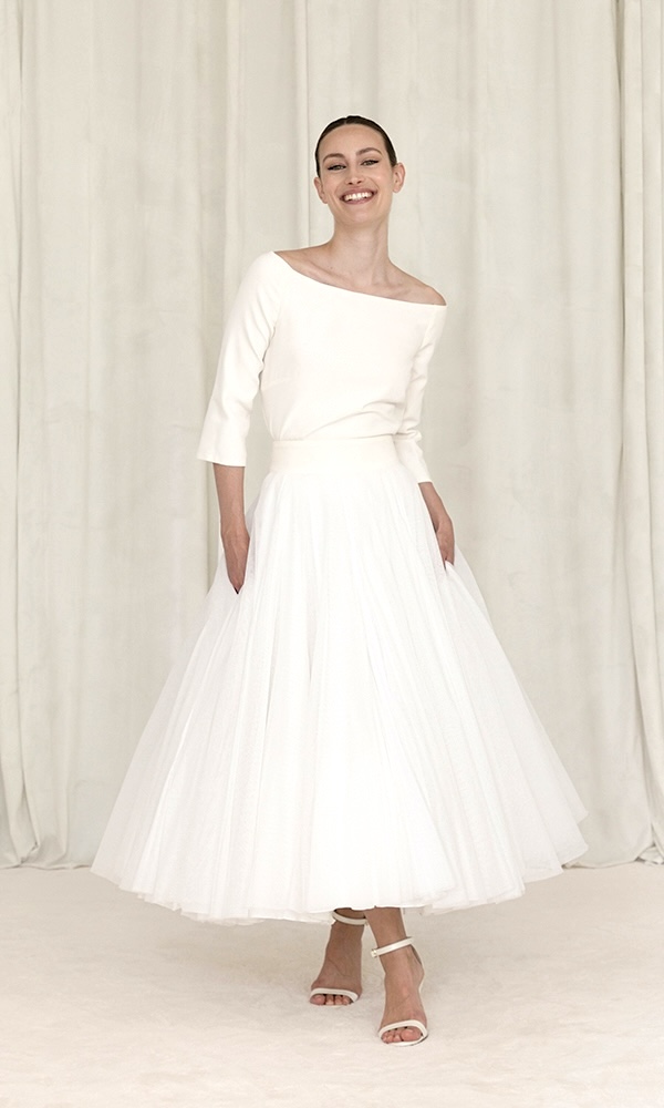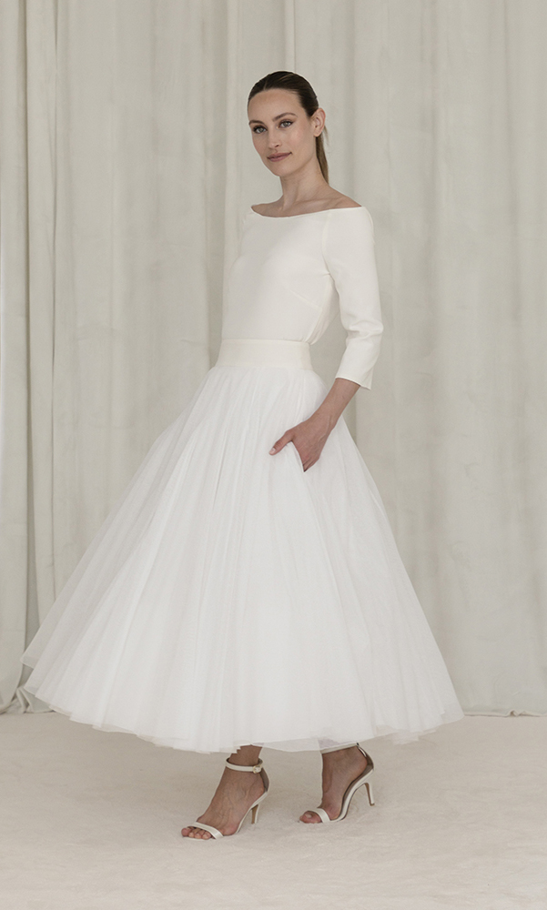 Silk crepe top with Bardot collar. Match it with many of the skirts in our collections !
