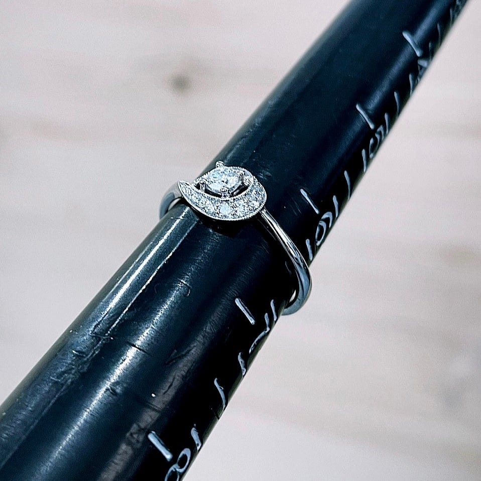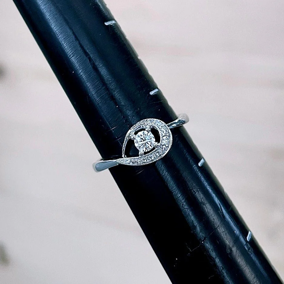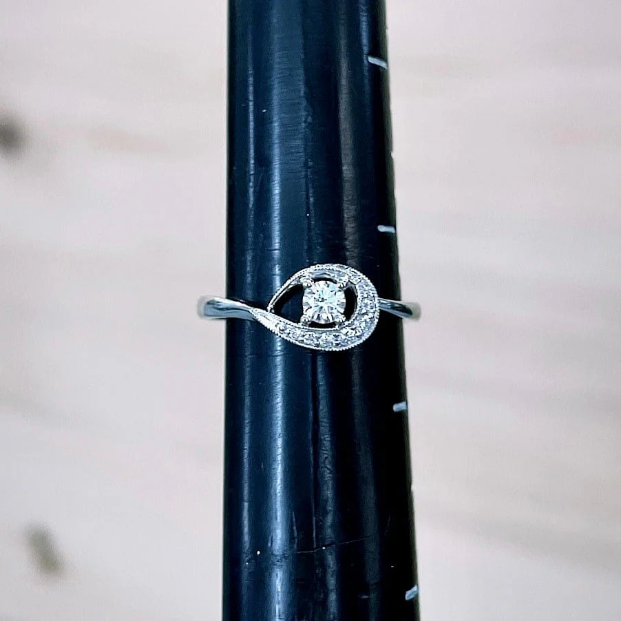 Conçue en or blanc 14K, cette bague au design torsadé met en valeur un diamant central naturel, délicatement entouré d’un motif courbe serti de petits diamants. Un modèle raffiné, à la silhouette distinctive, parfait pour se démarquer avec élégance.