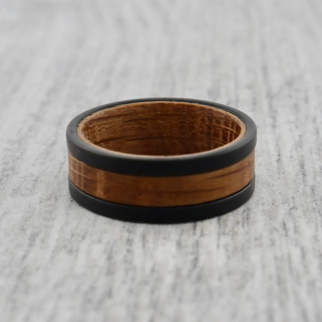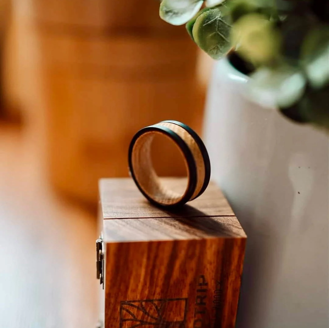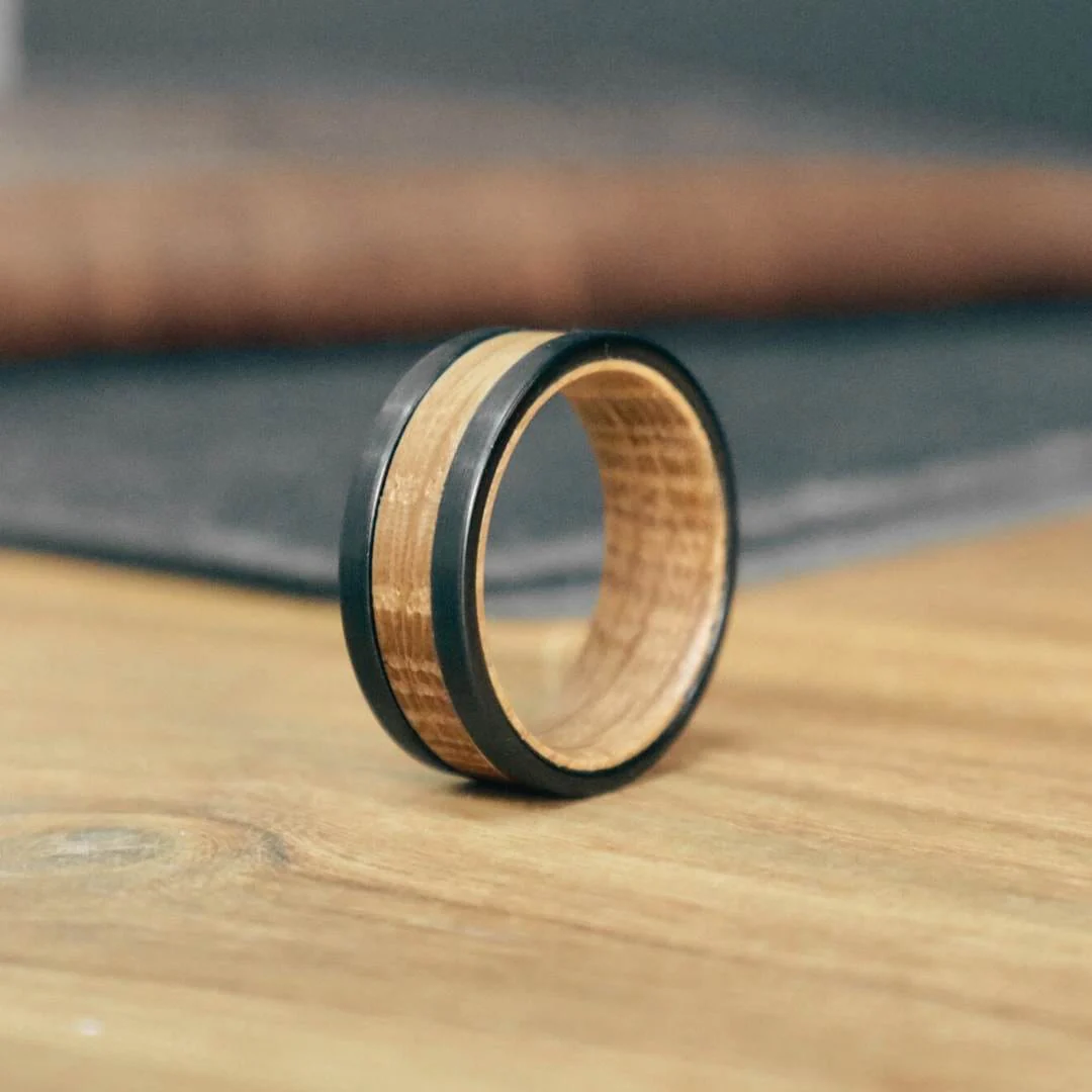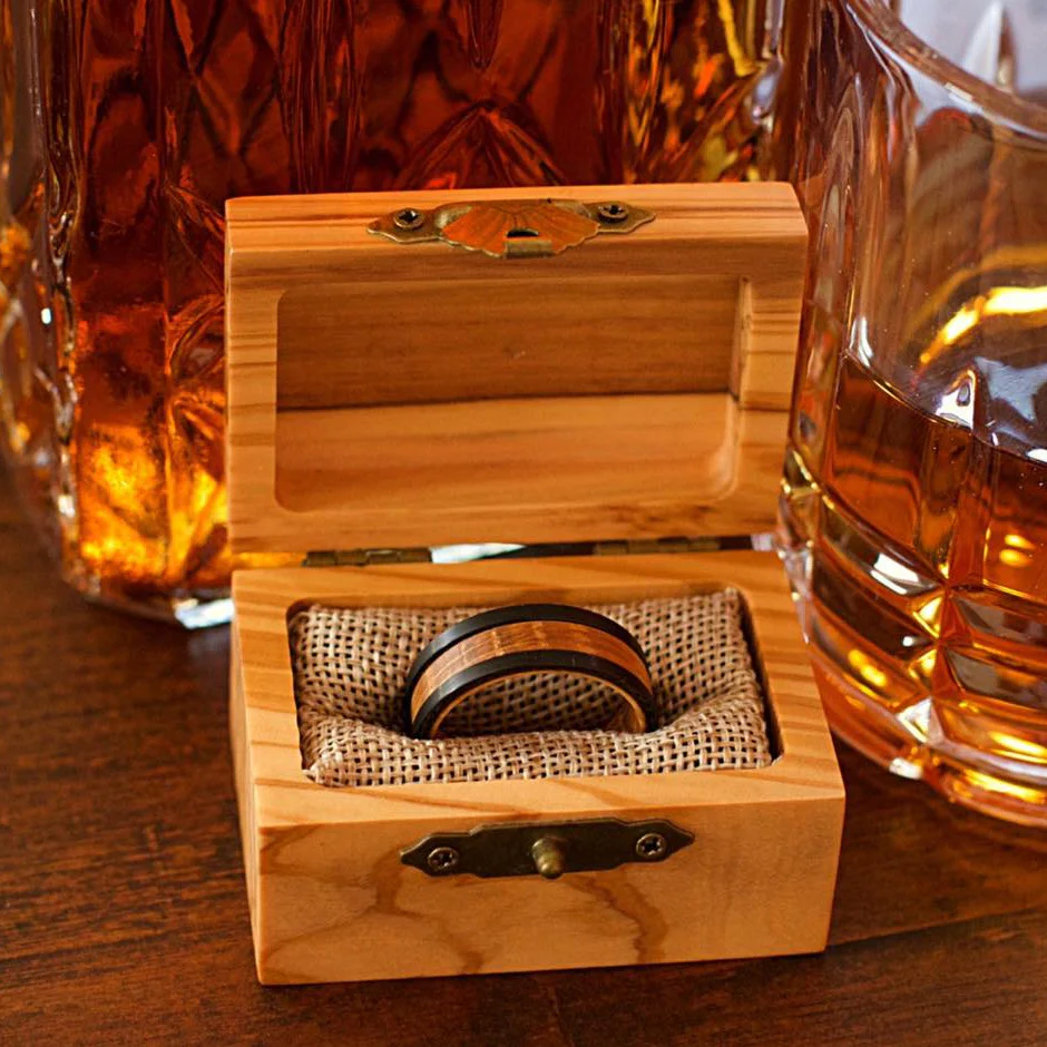 Les bagues Roadtripmadewood ont commencé leurs vies dans les fûts de whisky fabriqués en chêne. Tous le bois des barils sélectionnés sont très similaires, mais pas identiques. Ces bandes sont fabriquées à partir de bois récupéré provenant des fûts vieillis. La plupart du bois que nous utilisé contient des traces de chêne carbonisé unique!