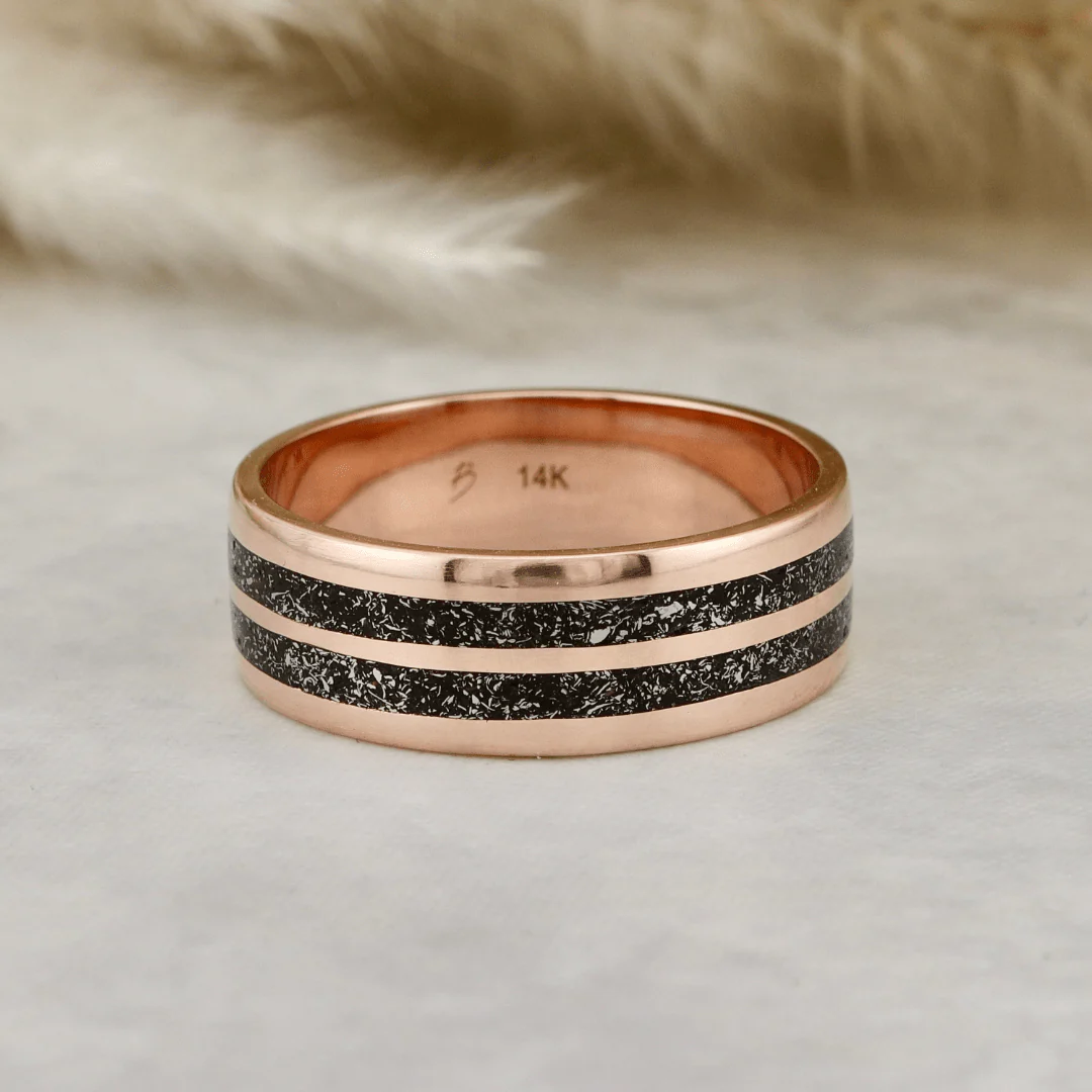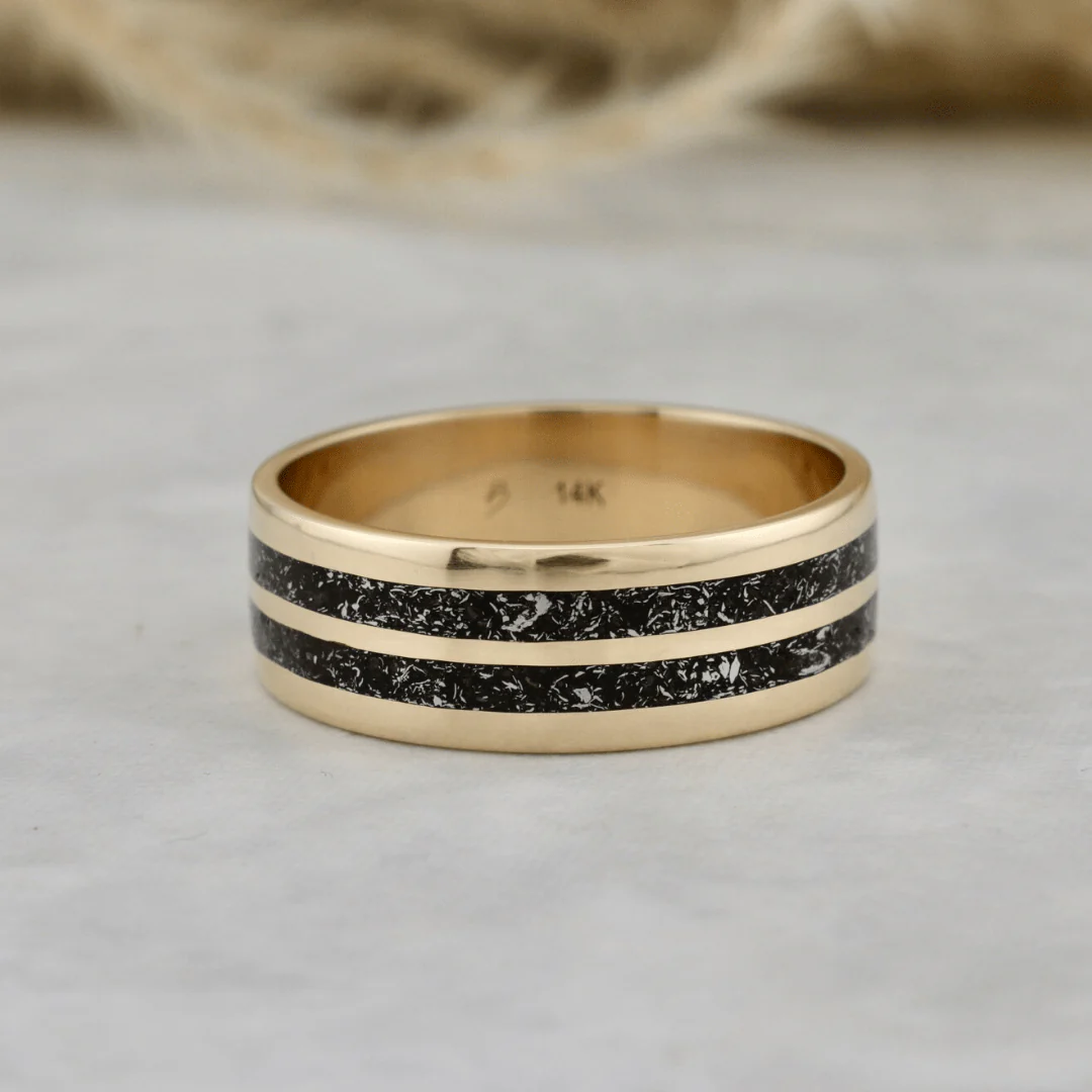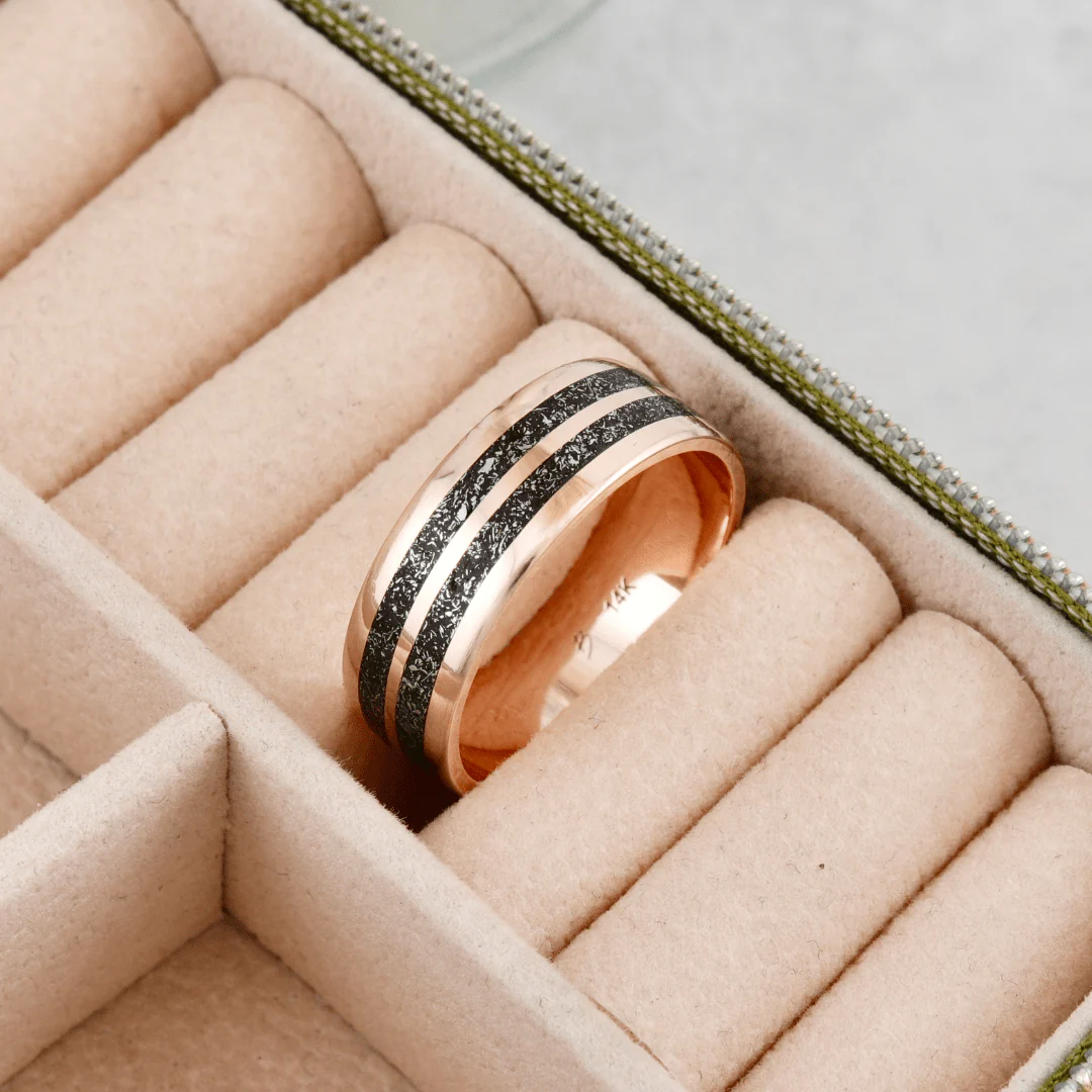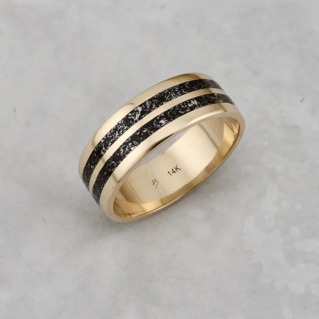 Offrez une alliance véritablement unique ! Chaque bague Poussières d’étoiles présente une incrustation de véritables fragments de météorite. La finition manuelle à la cire d’abeille naturelle protège la bague et met en valeur le contraste délicat entre le métal et la météorite. Le résultat : une surface douce, ni totalement lisse ni très texturée, pour un bijou au caractère singulier. Un symbole rare, parfait pour marquer un engagement ou souligner un moment d’exception.