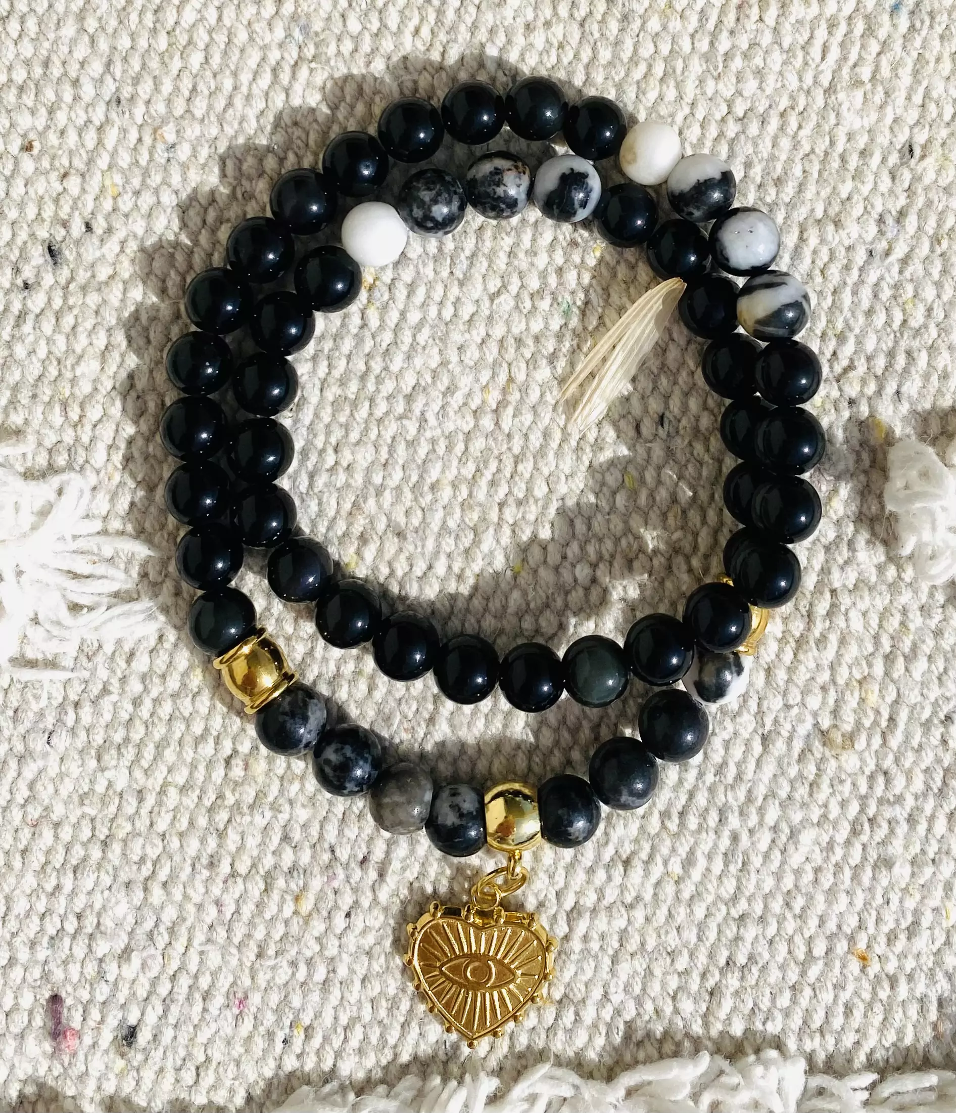 Bracelet double tours en pierres naturelles Obsidienne 6mm style bohème avec breloque ‘Coeur avec oeil protecteur’ doré en acier inoxydable.