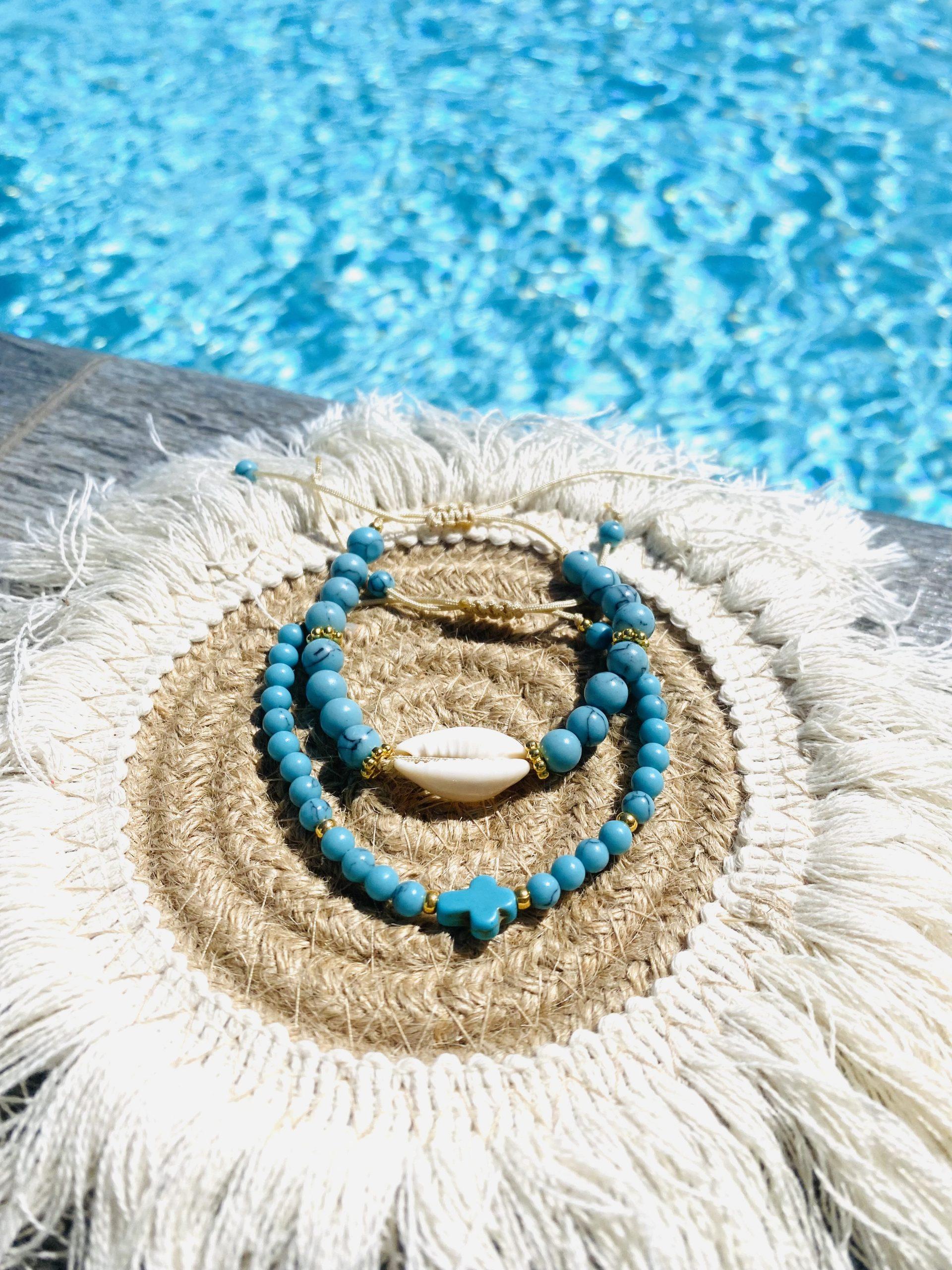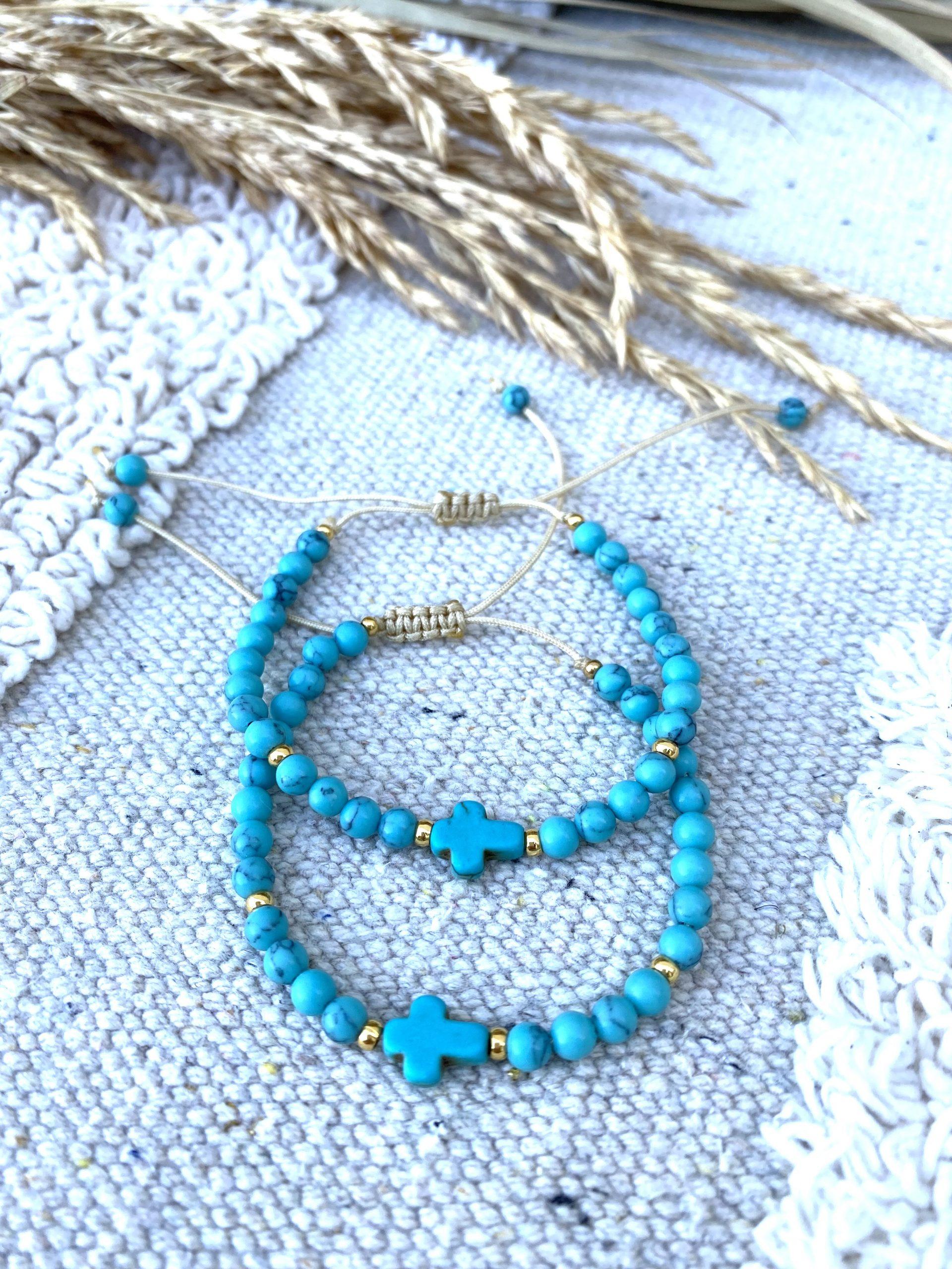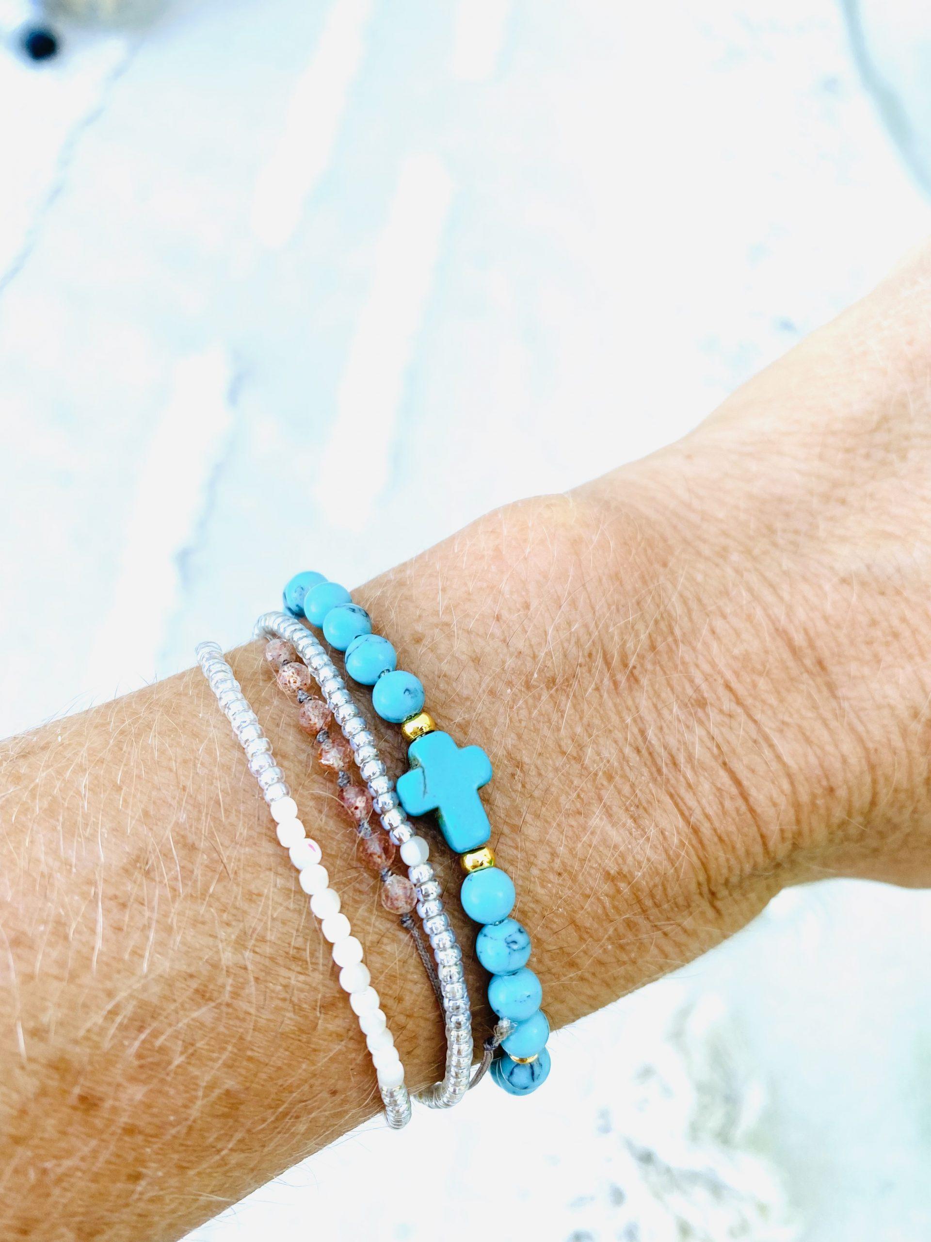 Pierre Turquoise et petite croix. Sur le plan psychologique, cette pierre permet l’apaisement, l’empathie et le calme.