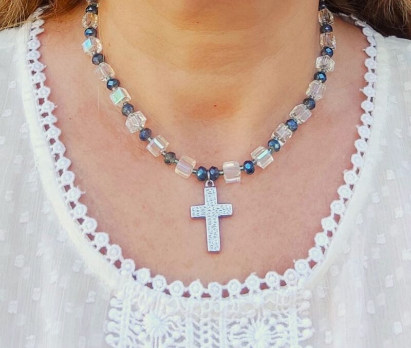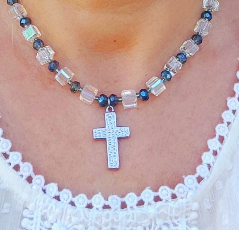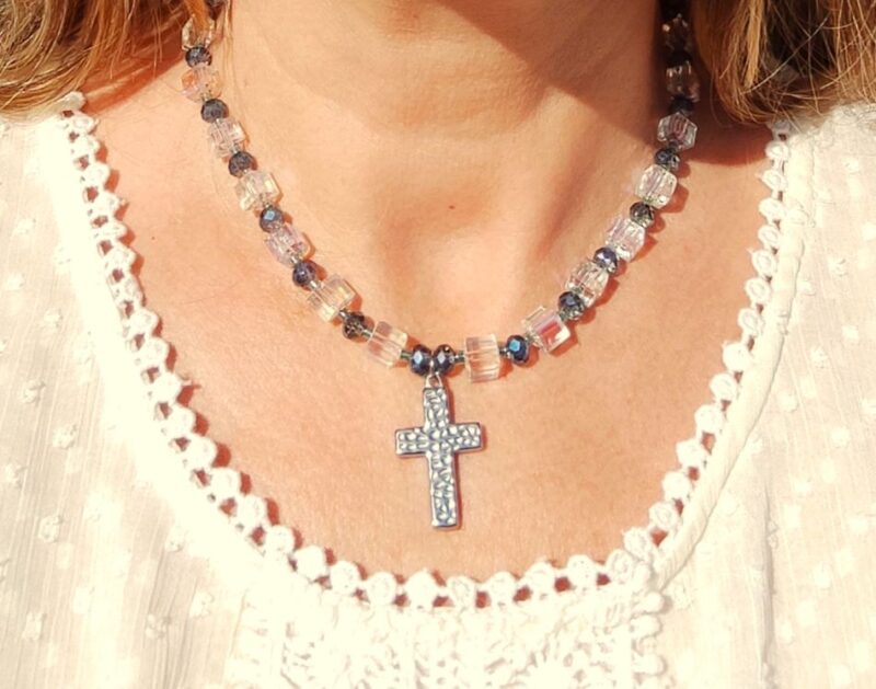 Très jolie croix en acier inoxydable martelé et perles rocailles carrées scintillantes et ovales bleues