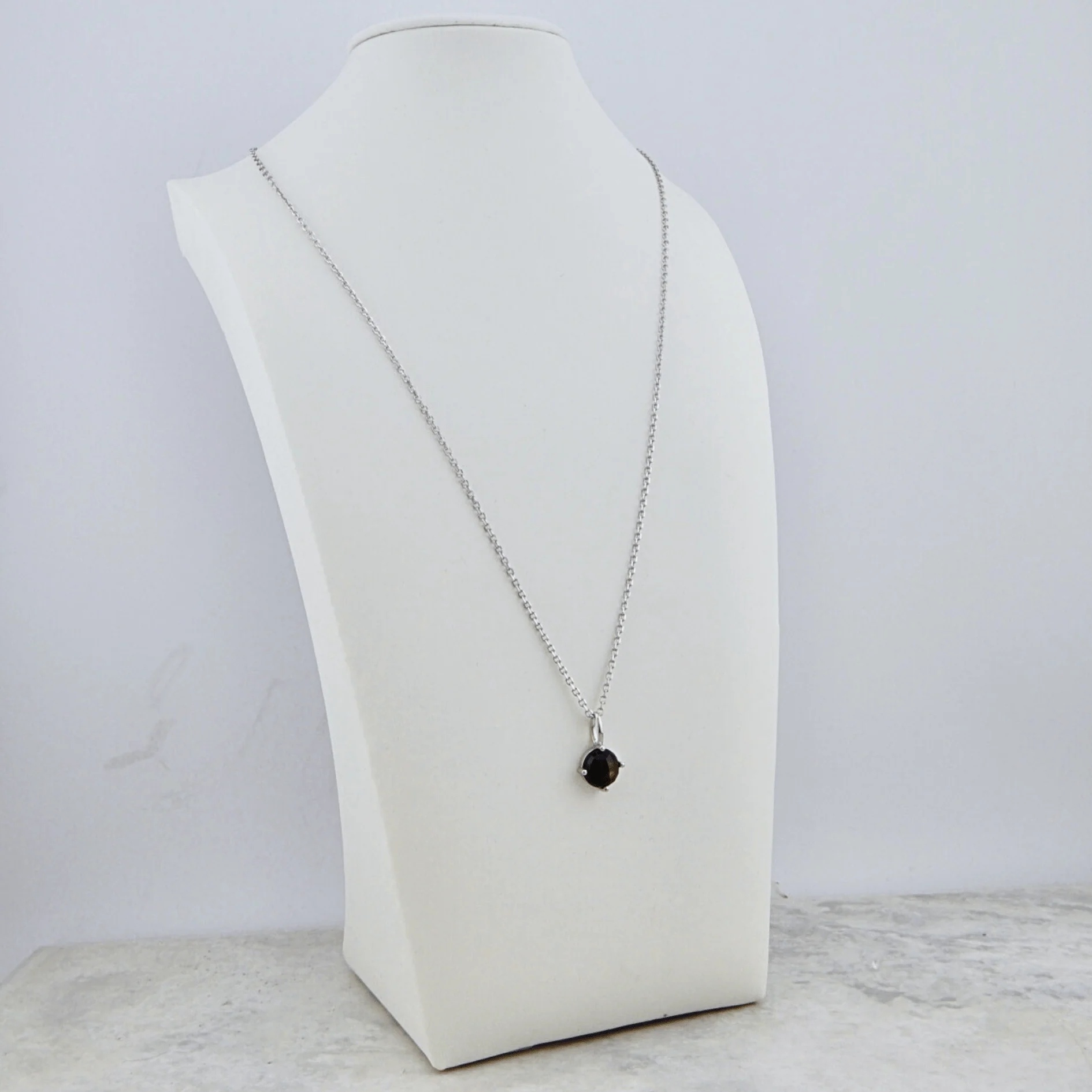Ce collier minimaliste présente un saphir doré rond à dos plat. La pierre, aux teintes brun-noir et aux reflets dorés, crée un effet subtil de brillance. Le pendentif, discret et épuré, est monté sur une chaîne de 18 pouces, pour un look simple et intemporel.