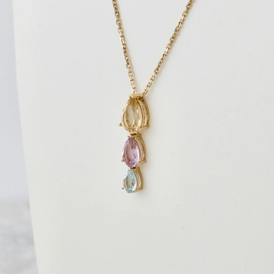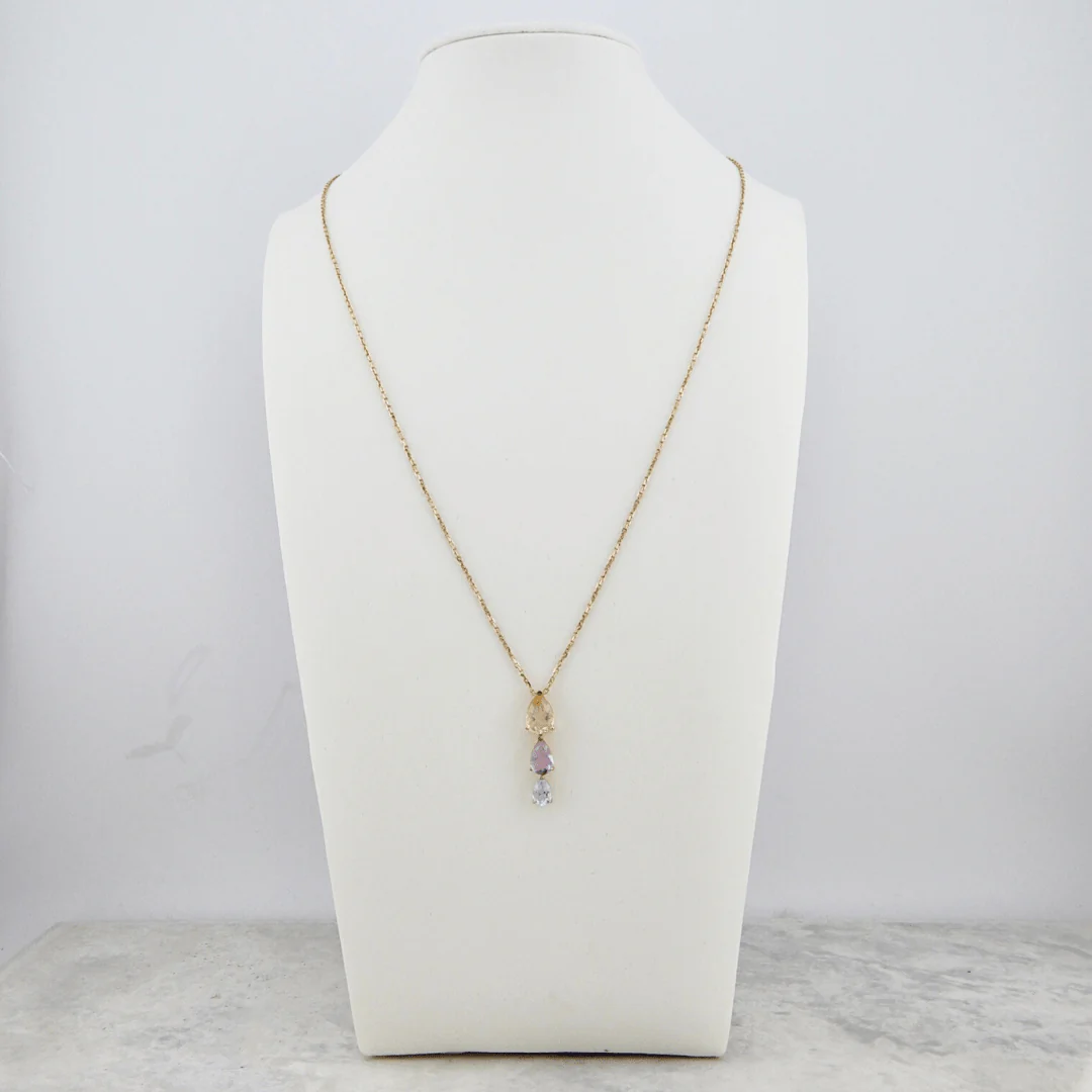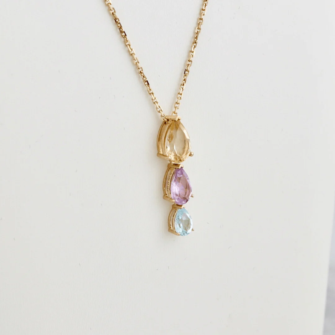 Ce collier unique en or jaune 14K met en valeur trois pierres en forme de poire, suspendues verticalement du plus grand au plus petit. Avec leurs teintes pastel délicates, ces pierres créent une harmonie douce et colorée.