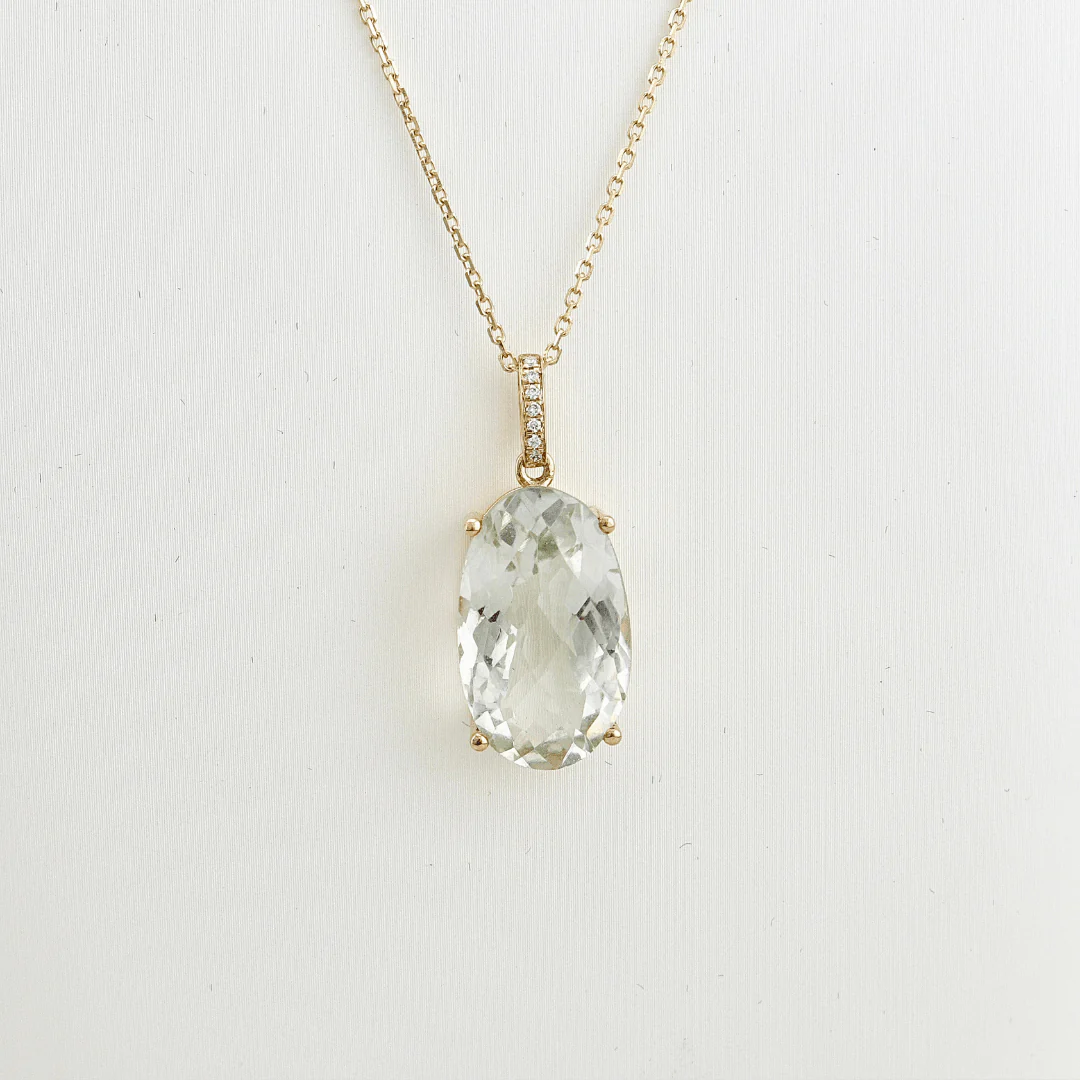 Ce collier en or jaune 14K présente une améthyste verte ovale de 12,89 ct, d’une douce teinte verte qui lui confère une beauté naturelle et apaisante. La bélière est ornée de diamants de laboratoire totalisant 0,035 ctw (F+, VS+), apportant une touche d’éclat subtil.
