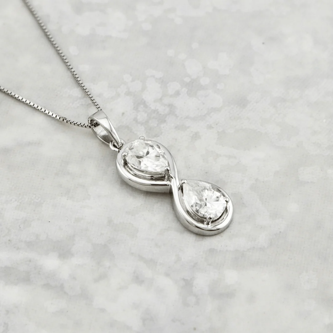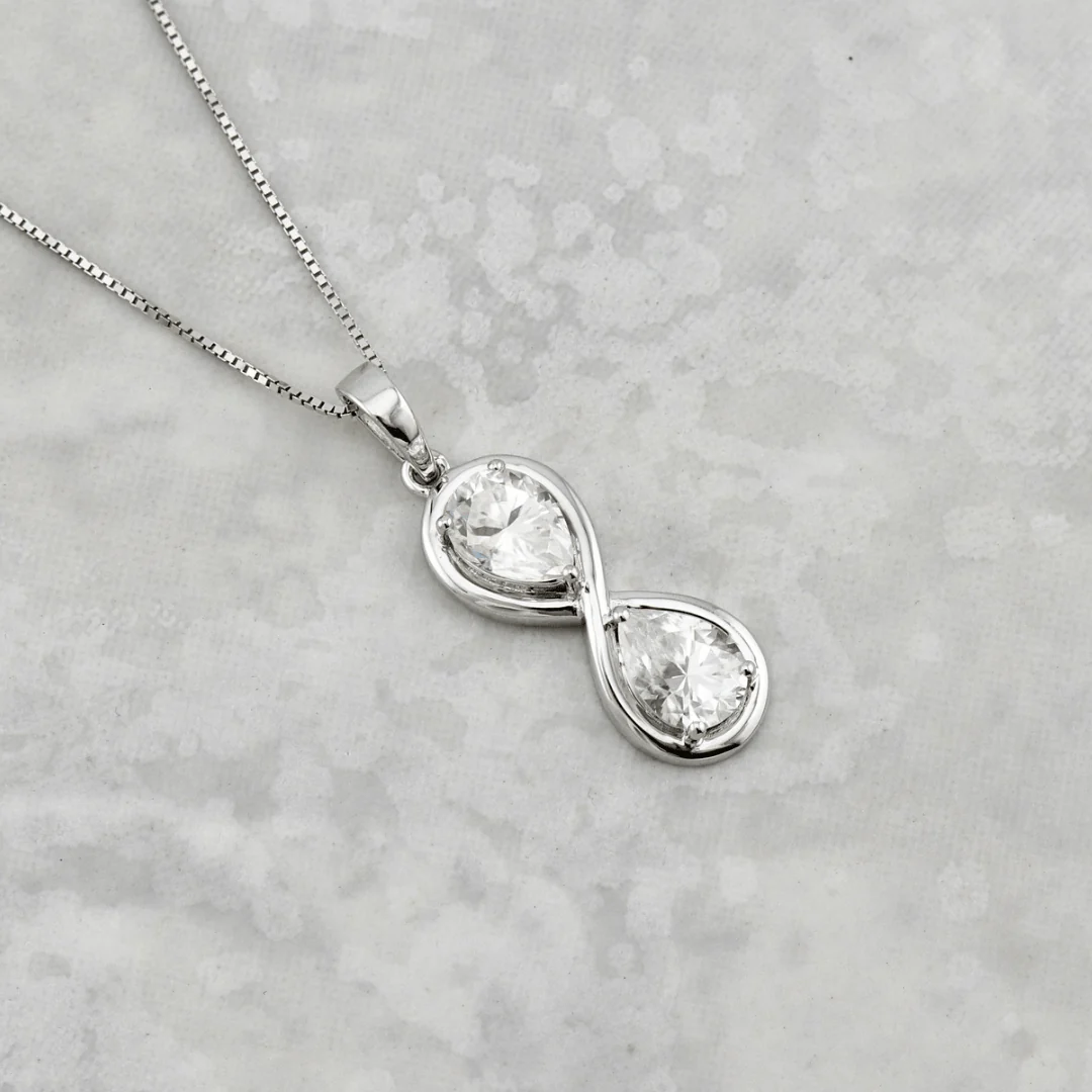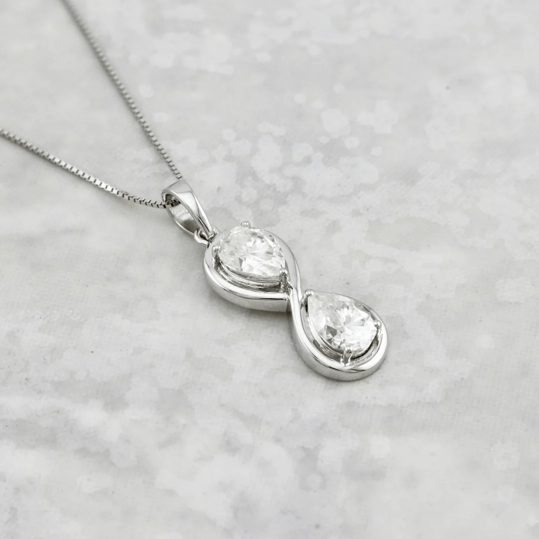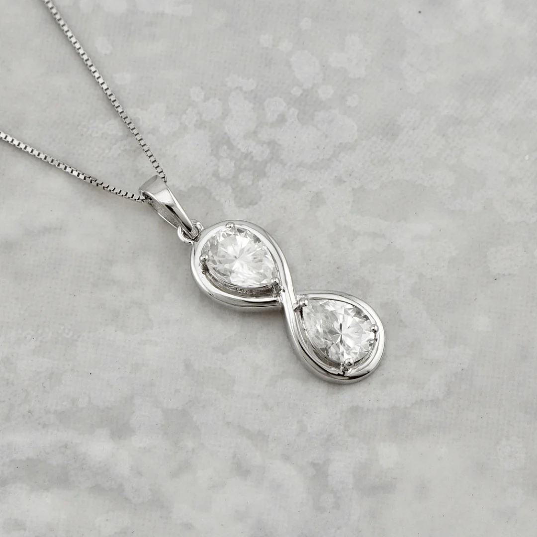 Ce pendentif a été pensé comme un symbole d’éternité et de lien précieux. Inspiré de la forme de l’infini, il place une pierre centrale au cœur de chacune de ses boucles — deux moissanites taille poire, brillantes et équilibrées. Chaque courbe, chaque serti souligne l’idée d’un lien continu, intemporel, à l’image des relations qui traversent le temps.