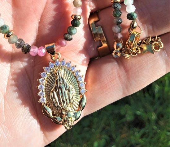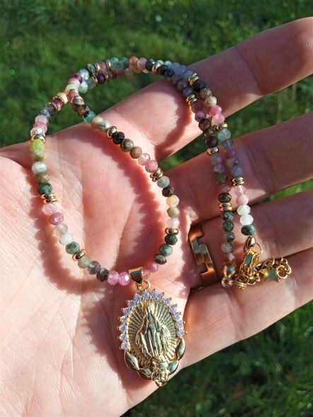 Pour la petite histoire, le 1er janvier 2023 j’ai eu envie de me faire un collier porteur de belles énergies pour la nouvelle année et voilà le résultat : ce superbe collier en tourmaline facettée, acier inox or avec un pendentif Sainte Marie orné de zircons.