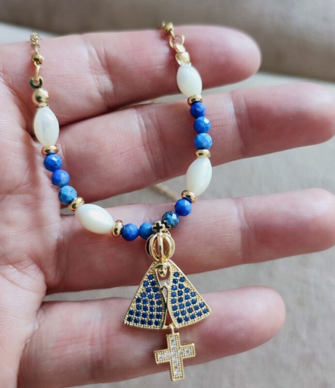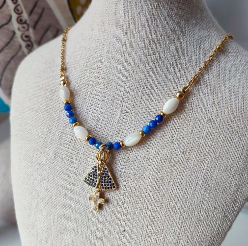 Superbe pendentif plaqué or : Sainte Marie avec couronne, croix, strass bleus et petite croix strass blanc, longueur 3 cm