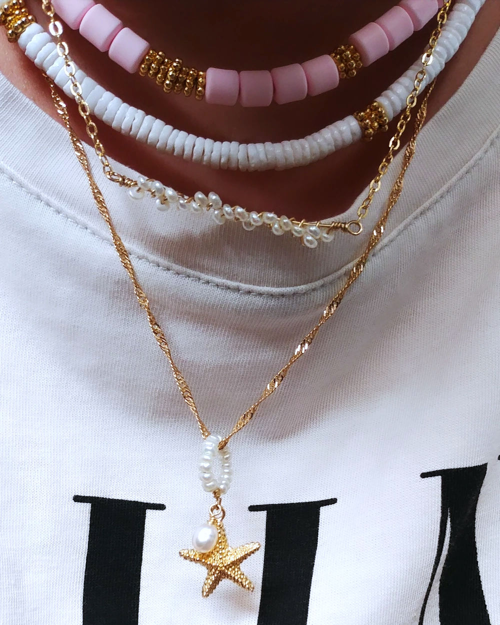 Collier composé  d’une étoile de mer plaquée or décorée d’une perle de culture montées sur une boucle de perles de culture .