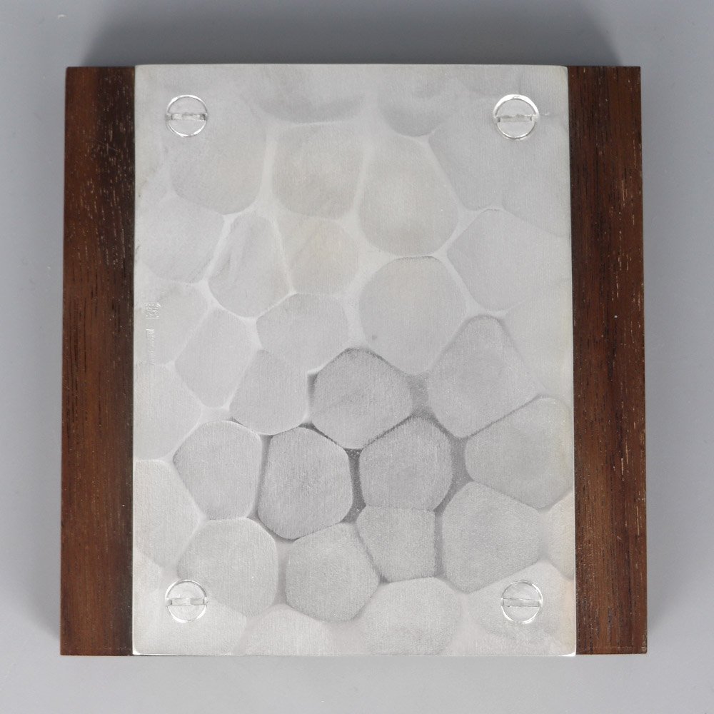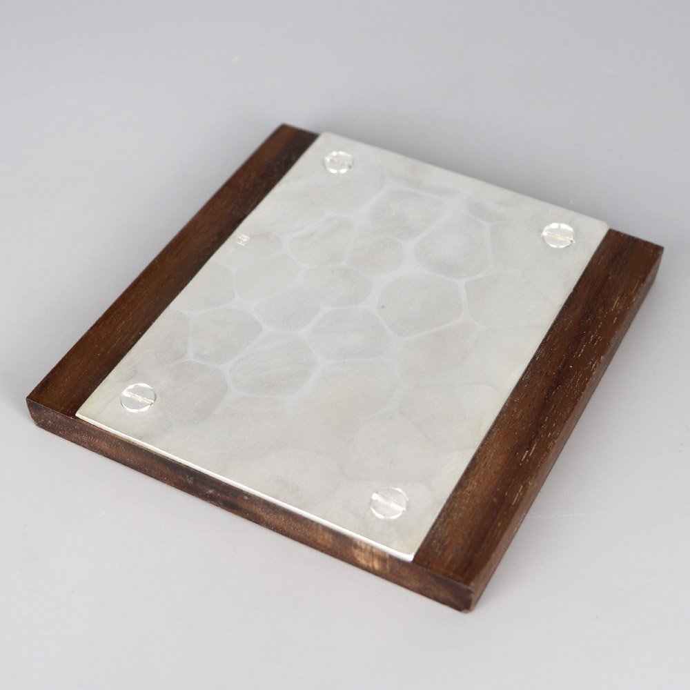 Dessous de bouteille en noyer d’Amérique et métal argenté martelé à la main.