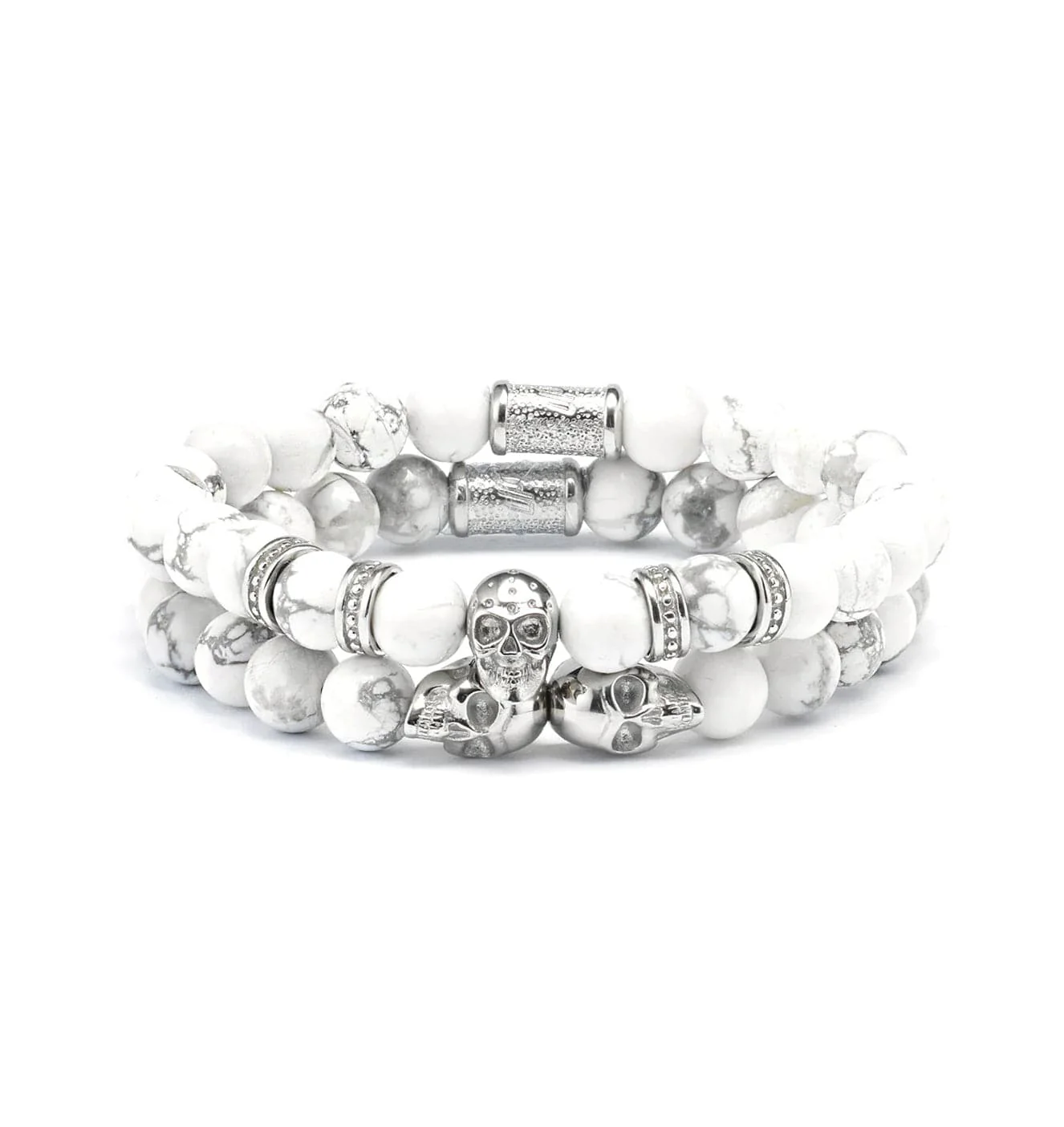 Une dédicace aux guerriers et aux conquérants de l’époque des Vikings dans le nord de la Scandinavie. Un nouveau design fait de pierres blanches, avec des veines noires fantomatiques. Les pierres sont assorties aux crânes argentés semi-brillants.