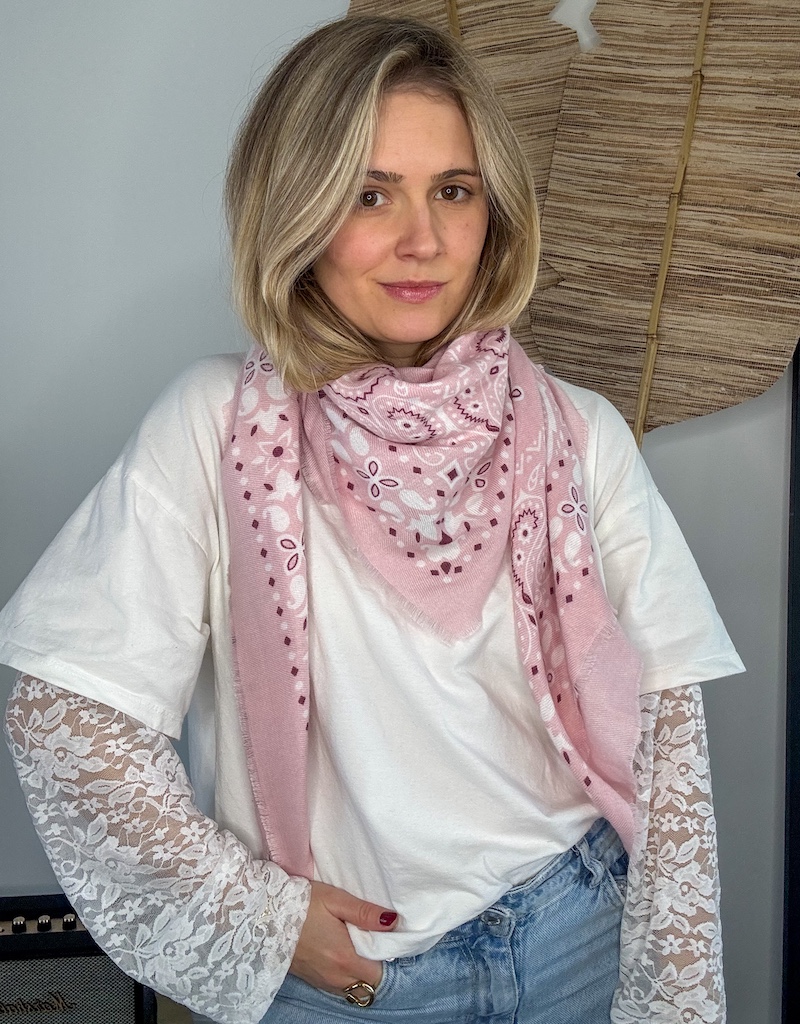 Grand Foulard tout doux imprimé bandana rose qu’on adore !