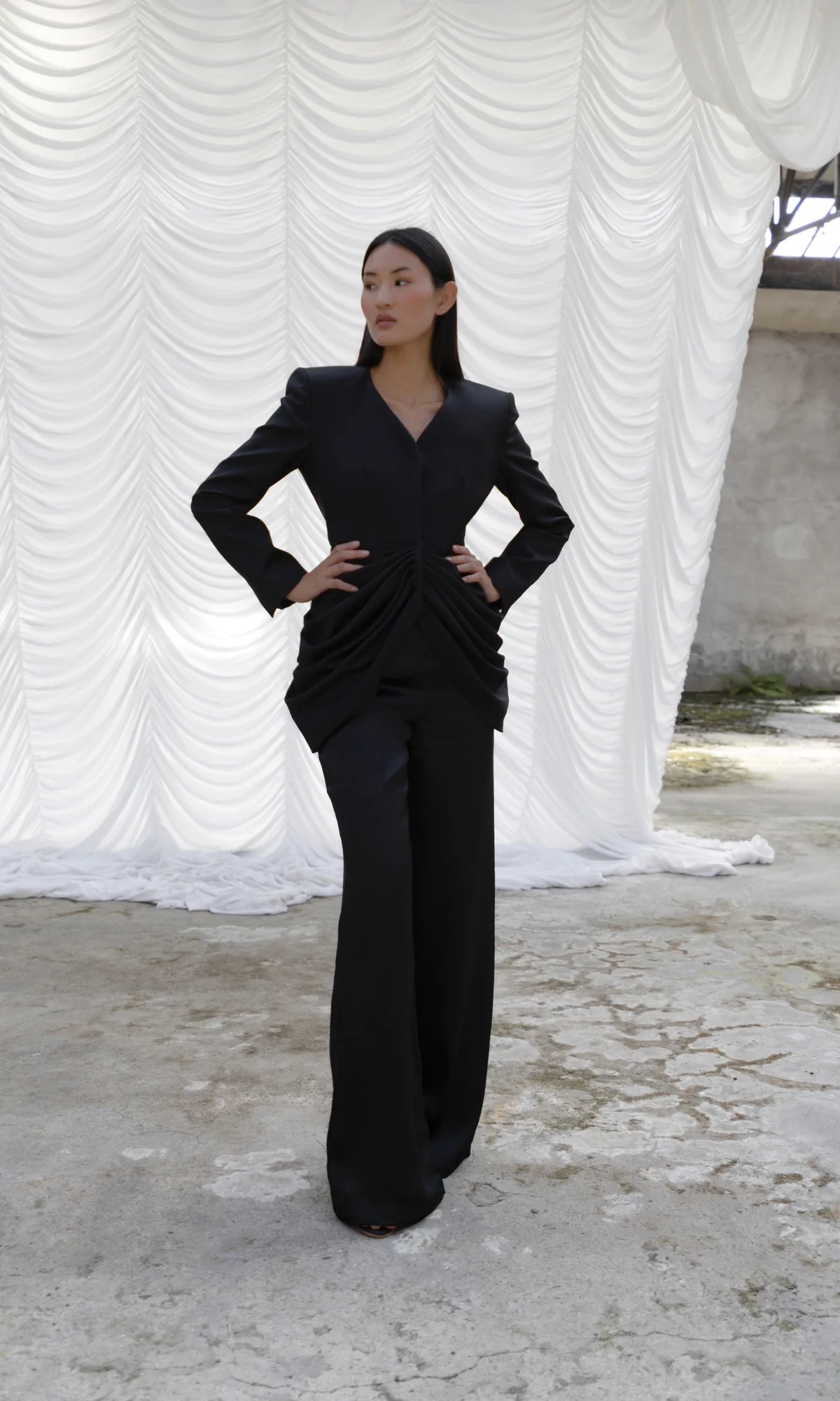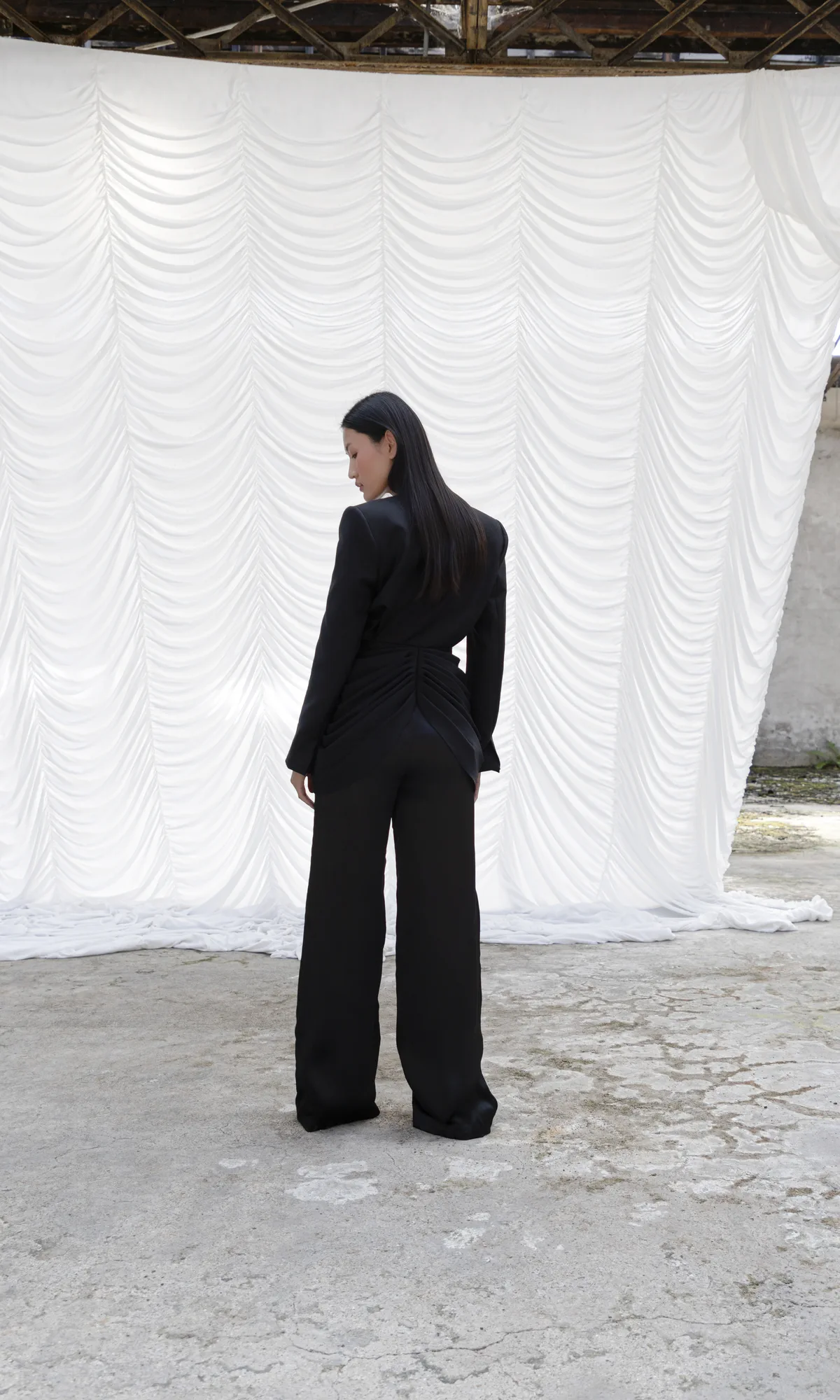 J’ai imaginé ce tailleur traditionnel ultra féminin (veste fabriquée à la main, entoilée et doublée) en pensant aux thèmes forts de la collection: drapés, minimalisme et élégance intemporelle.