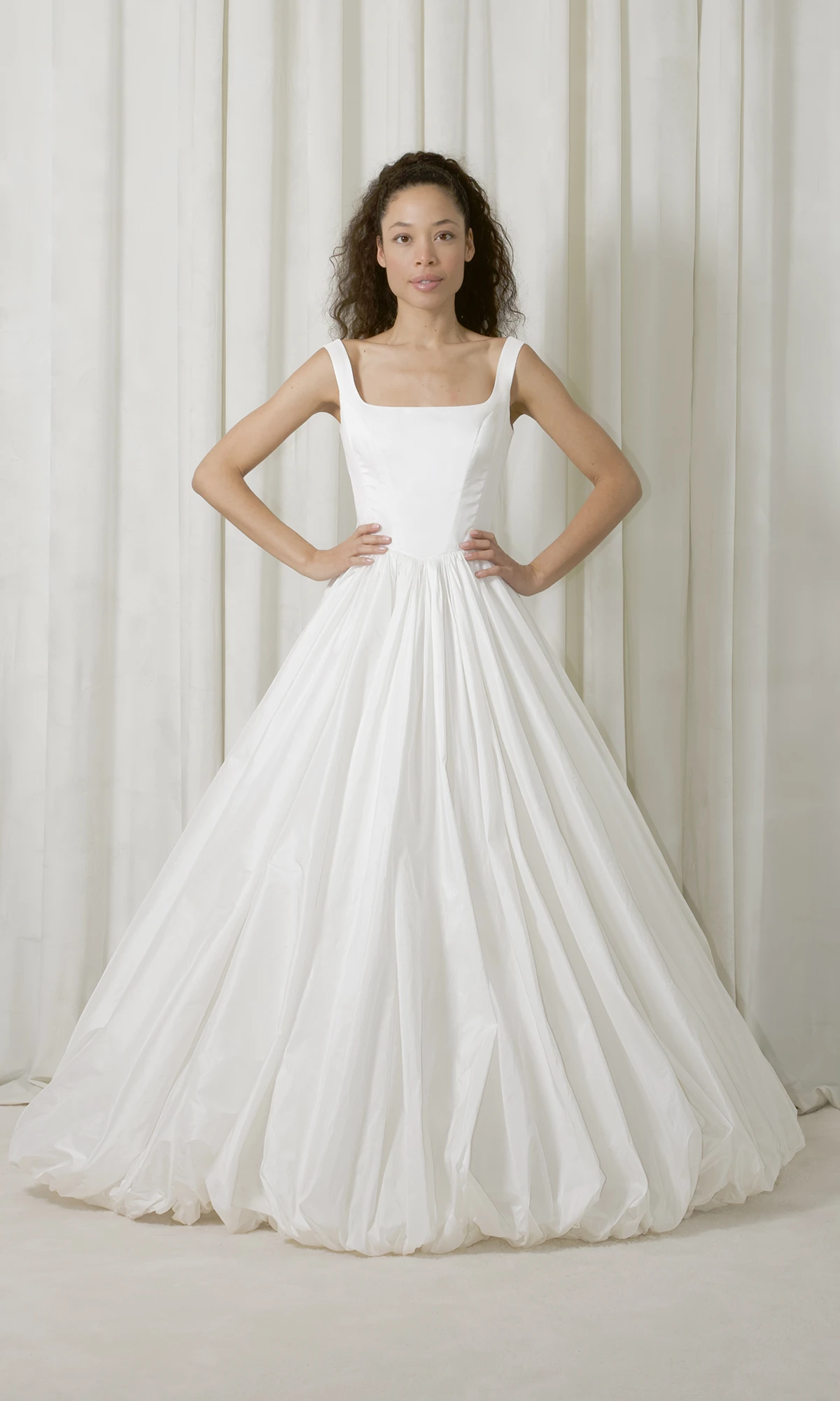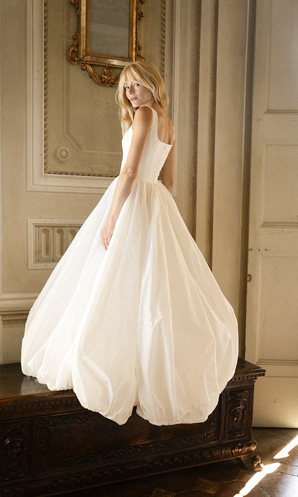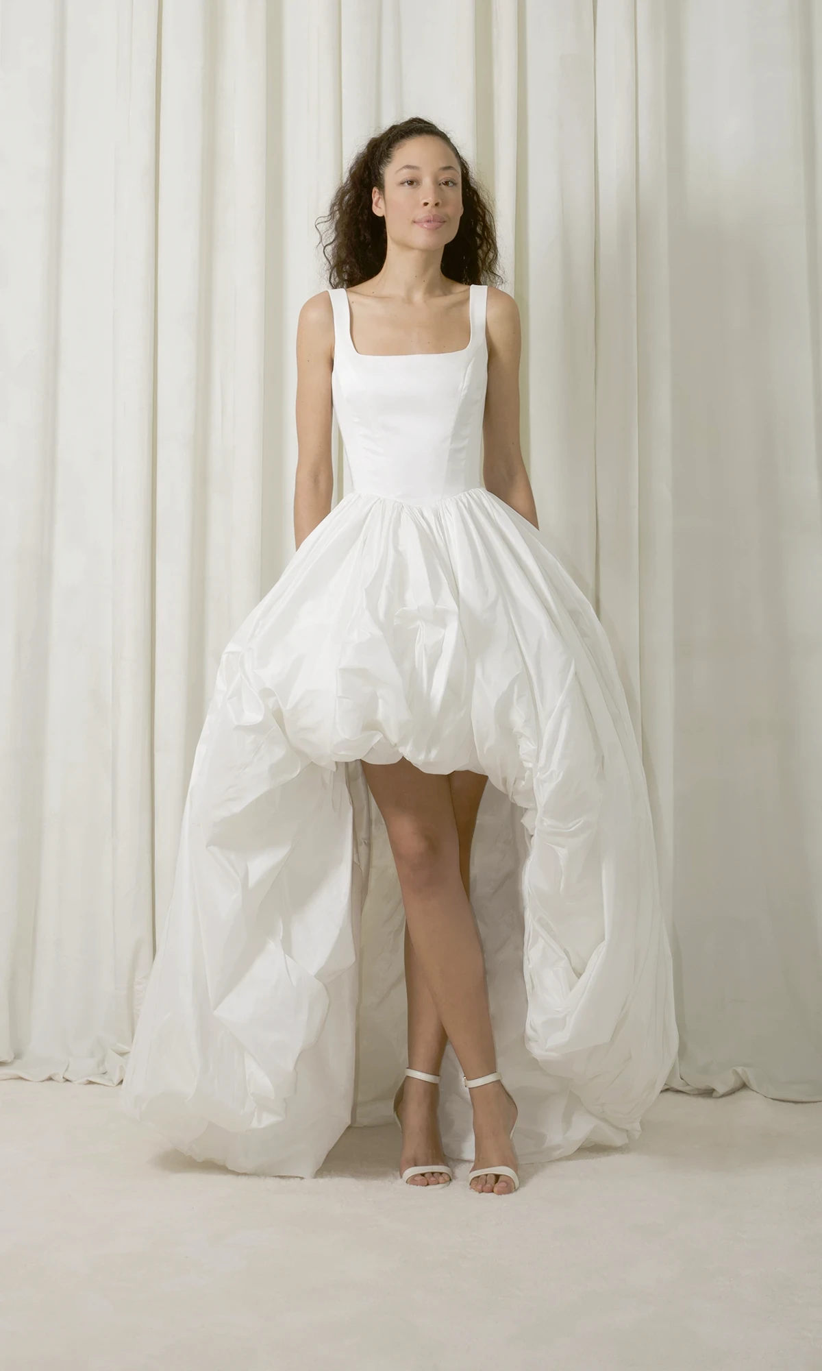 Cette robe de mariée princesse avec son ourlet boule froncé est un pur bonheur! Sa quantité de tissu taffetas fait rêver… Et vous adorerez la porter courte puis longue ou vice versa !
