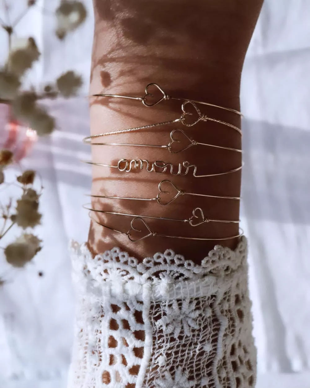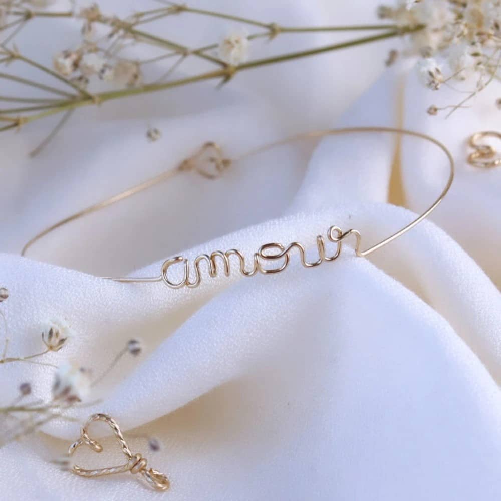 Bracelet ultra fin en fil précieux entièrement sculpté à la main du mot « amour » & fermé par une boucle en forme de cœur.