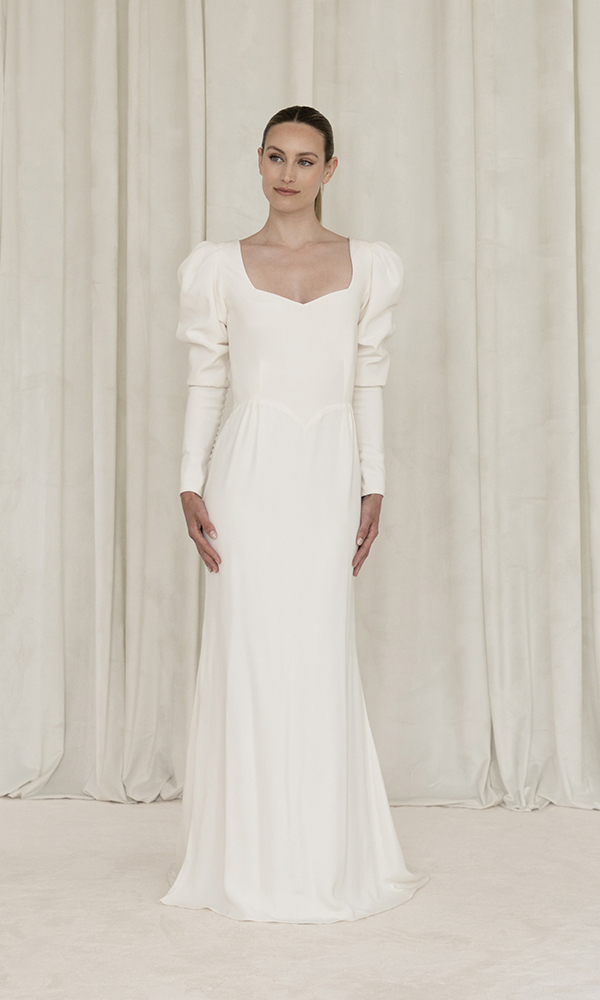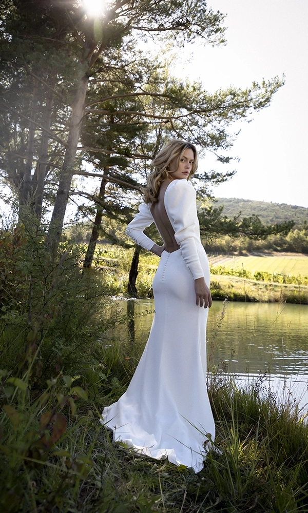 The LA SENSUELLE silk long-sleeved wedding dress is a treasure of purity. It’s all about the silhouette and the bare back. I recommend it for a winter wedding. Worn with our LA B faux fur coat, you will be divinely elegant and glamorous.