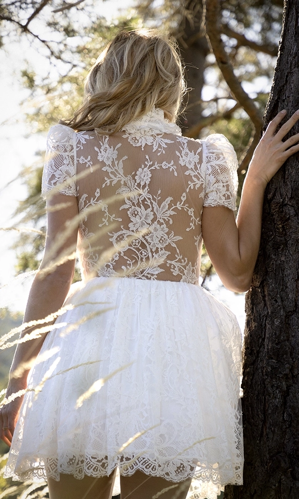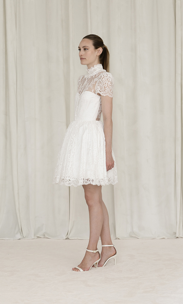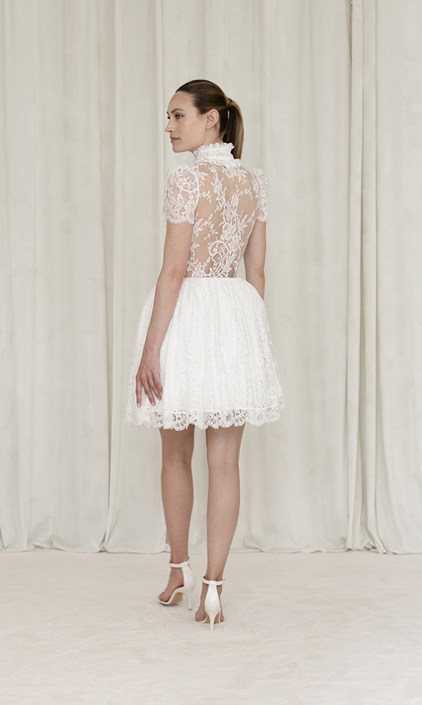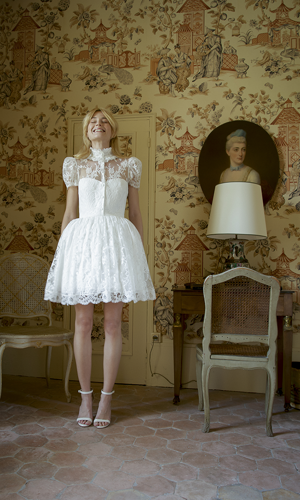 J’aime cette robe de mariage courte en dentelle de Calais à la fois royale et fashion ! Ses petits mancherons et son col victorien sont vraiment adorables !