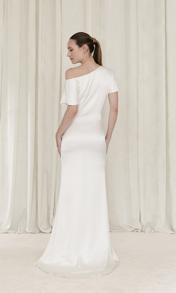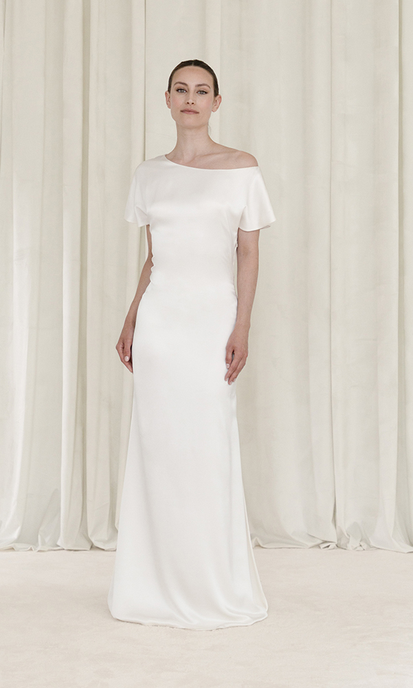 J’adore la simplicité de cette robe de mariée. Tout le charme est dans le satin de soie que l’on pourra sculpter sur vous pour mettre en valeur vos courbes.