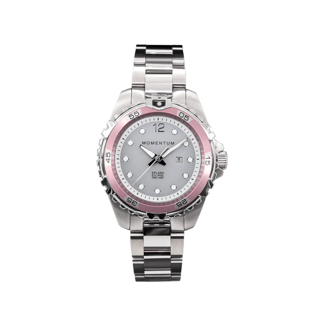Tous les modèles Splash sont dotés de couronnes vissées de haute qualité qui se vissent dans le boîtier pour une étanchéité extrêmement fiable, donnant au Splash une profondeur nominale de 200 m/660 pieds. La fonction vissée garantit également que la couronne ne sortira pas accidentellement.