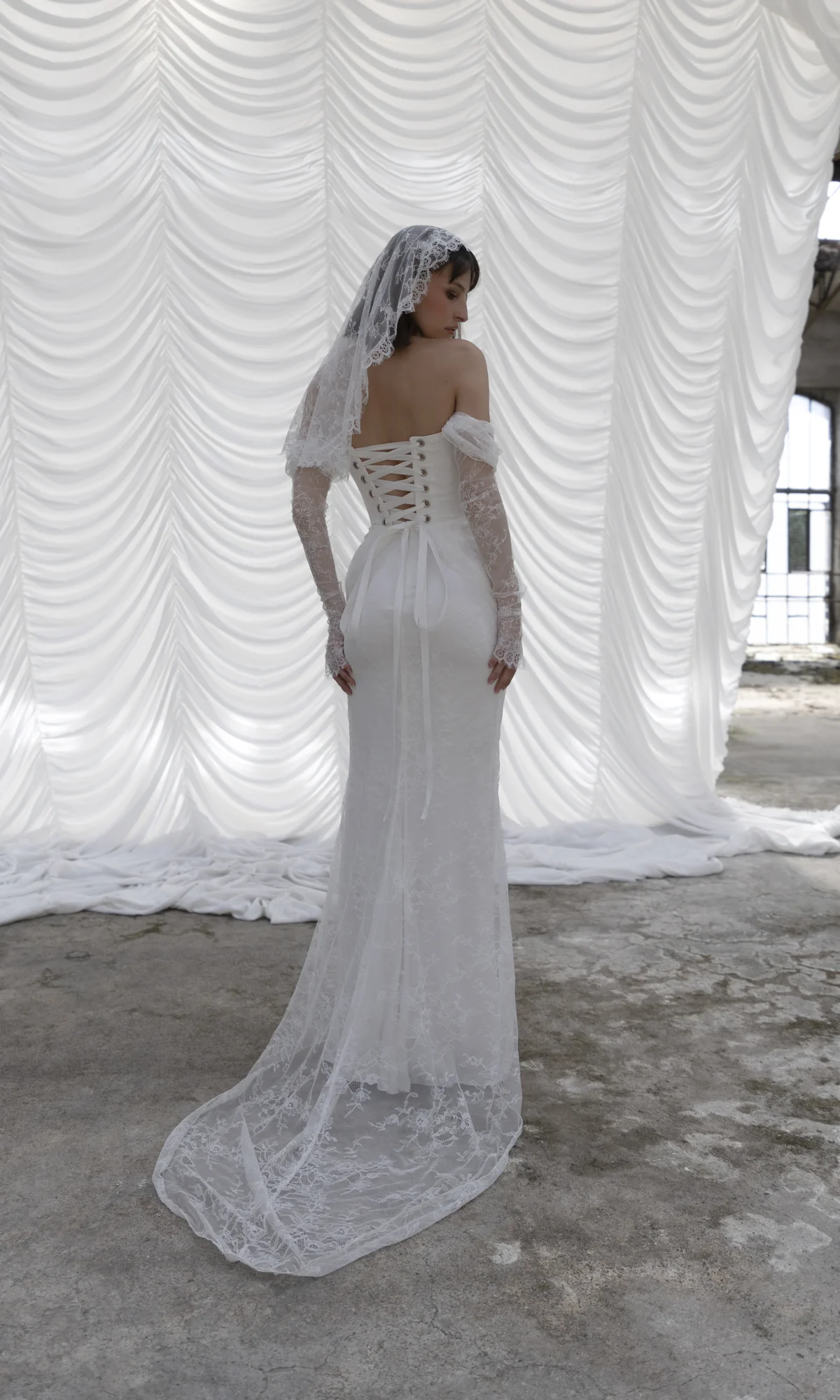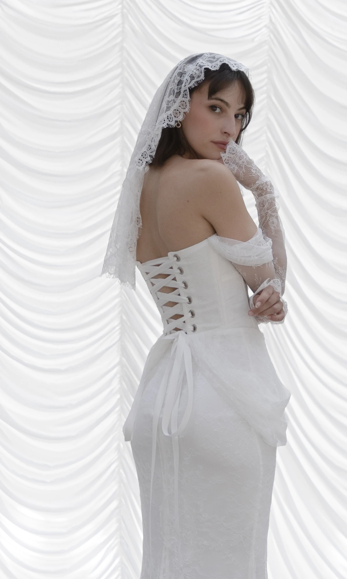 This lace-up corset wedding dress will enhance your figure. Worn with matching gloves and a short veil, all you have to do is wait for the big day. Everything you need to look elegant and attractive is right here.