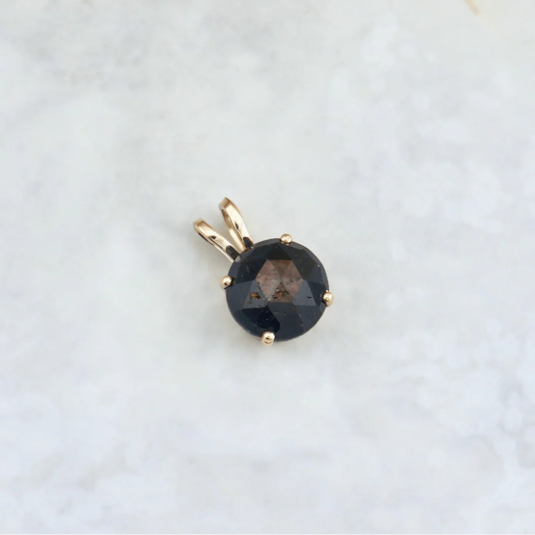Ce pendentif minimaliste présente un saphir doré rond à dos plat. La pierre, aux teintes brun-noir et aux reflets dorés, crée un effet subtil de brillance.