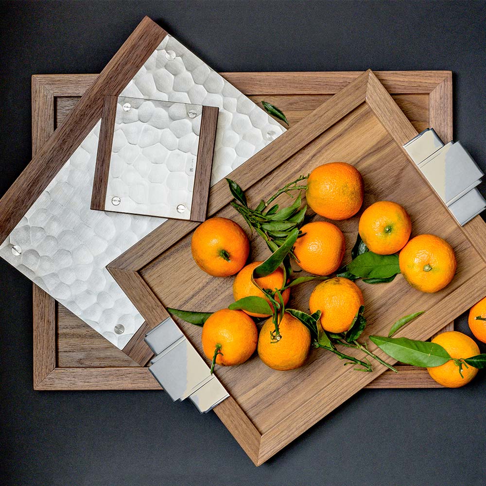 Petit plateau en noyer d’Amérique et poignées en métal argenté.