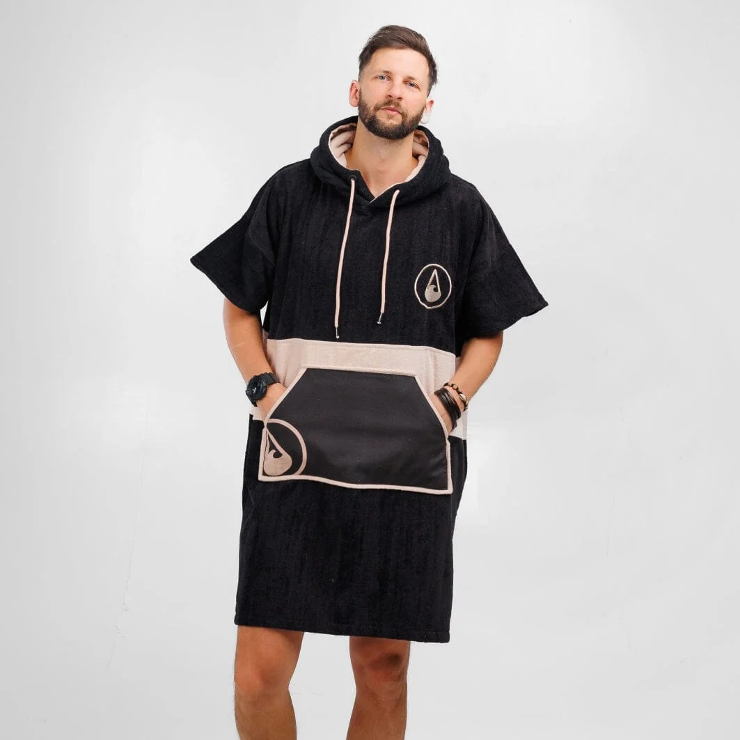 Der Poncho Barravento bietet ultimativen Komfort und Funktionalität. Außen sorgt weiches, robustes Velours für eine edle Optik, während die Innenseite aus saugfähigem Frottee für ein angenehmes Hautgefühl sorgt. Die hochwertigen Materialien bestehen zu 100 % aus Baumwolle nach Öko Tex Standard 100 und sind besonders hautfreundlich. Eine zweilagige Kapuze mit hohem Kragen und Kordel schützt vor Wind und hält angenehm warm. Zusätzlich bietet die große Fronttasche ausreichend Platz für Shampoo, Bürsten oder kalte Hände.