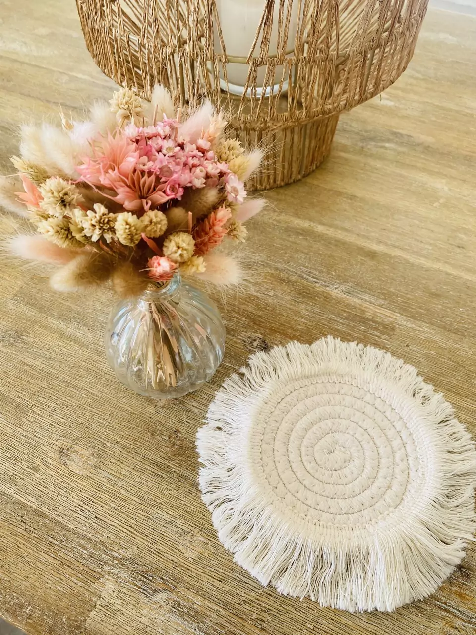 Magnifique sous verre naturel dans le style bohème. Vous pouvez également l’utiliser en sous vase avec mes jolis petits vases de fleurs séchées..