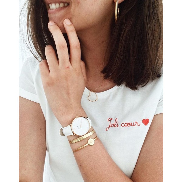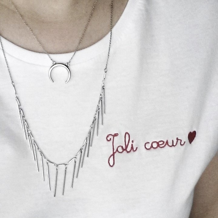 Côté bijoux, les colliers fins et délicats en accumulation sont les meilleurs amis du t-shirt à message, n’hésitez pas à mélanger les pendentifs. Look tendance assuré!